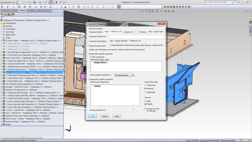 With the purchase of our second SolidWorks license, for the first time in my working life I share an office with another SolidWorks user. He’s a young Industrial Designer, just graduated with Honour’s from University . Good young bloke & once we educate him about real world working life & not just that Uni theory stuff he’ll be right He has a few years experience with SolidWorks & pretty much knows his way around the software. This afternoon he was working on a sliding restraint to secure crockery. He had modeled up the restraint and had inserted it in the cabinet Assembly as a Sub-Assembly. I watched for a while as he toggled screens between the Sub Assembly & the Assembly adjusting the slide to the position he wanted! He then worked out he could “Edit” the Assembly in context & adjust the slide that way as well. It was then I thought I should step in & educate him in the ways of Component Properties – Flexible Working (movable) Hinge & Gas Struts in Sub-Assembly Select Sub – Assembly – RMB (Right Mouse Button)Select – Component Properties Select Solve As – Flexible Simple as that. Movement in Sub-Assembly now available in Assembly.