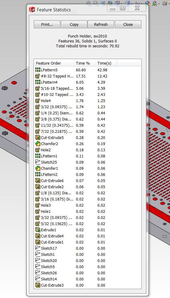 Processor: Intel Core i7 Q840 – 1.87Ghz (Turbo to 3.2Ghz), 8Gb RAM, 64bit Win7 Professional, ATI Mobility Radeon HD 5730 (1Gb) Using both the SolidWorks Benchmark Test & Anna Wood (SolidMuse) Punch Holder Benchmark these were the results: Following the purchase of our second SolidWorks Licence, the success of the XPS running SolidWorks, along with the lack of graphics issues with a non-certified cards we purchased another Dell Computer. Another non-workstation non-certified Dell Vostro 460 Desktop. Processor: Intel Core i7 – 2600 – 3.4Ghz , 8Gb RAM, 64bit Win7 Professional, NVIDIA GelForce GT420 (2Gb) Using the same tests these were the results: