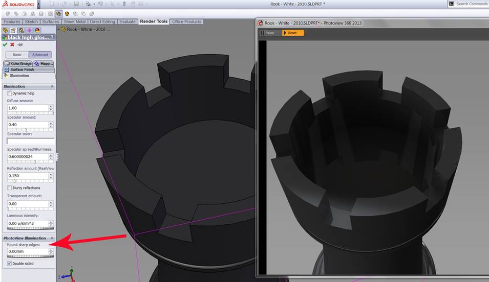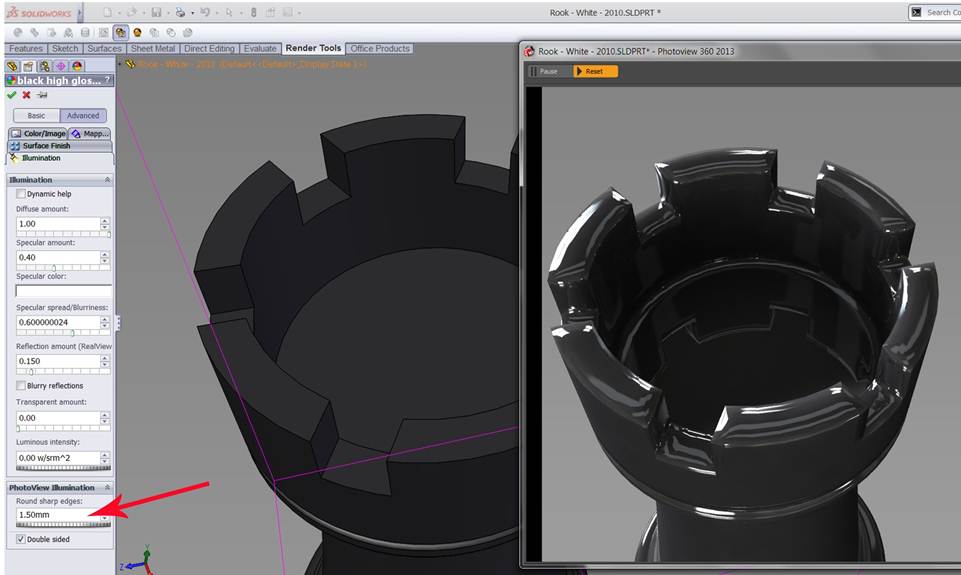Another new and interesting feature is “Decorative” Fillets. To add Decorative Fillet, “Edit” a material, Select Advanced, then Illumination. Under PhotoView Illumination, select Round Sharp Edges. Adjust Radius to the desired size.