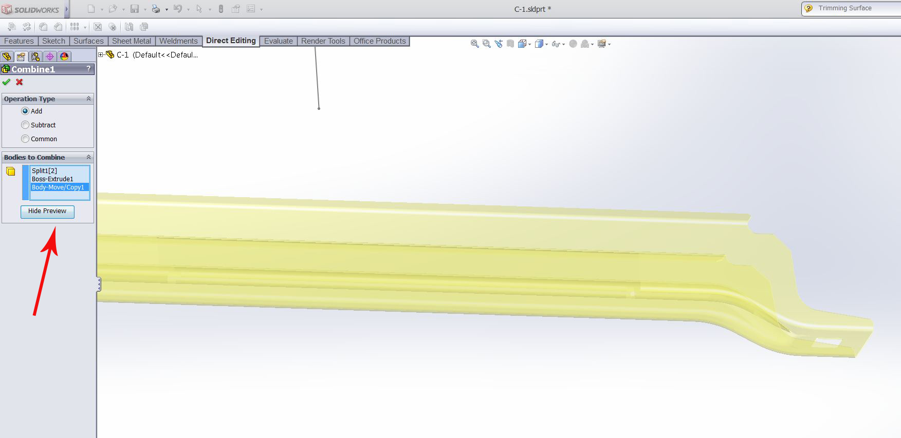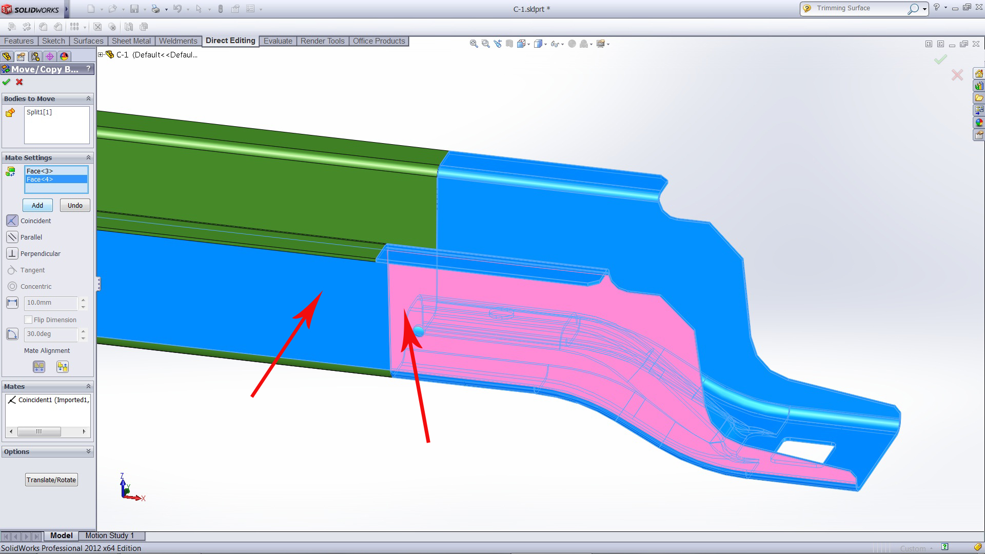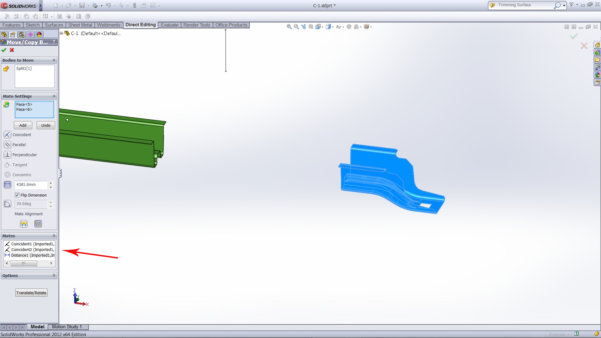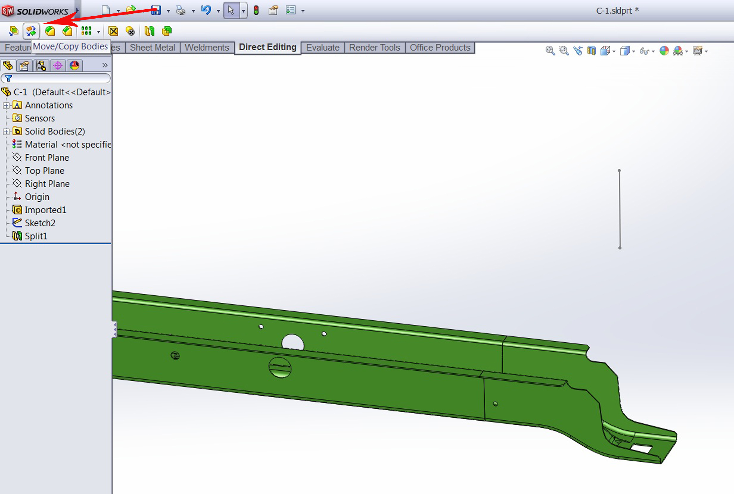 Now that the part is a series of multibodies I open “Direct Editing” on the Command Manger and select “Move/Copy Bodies