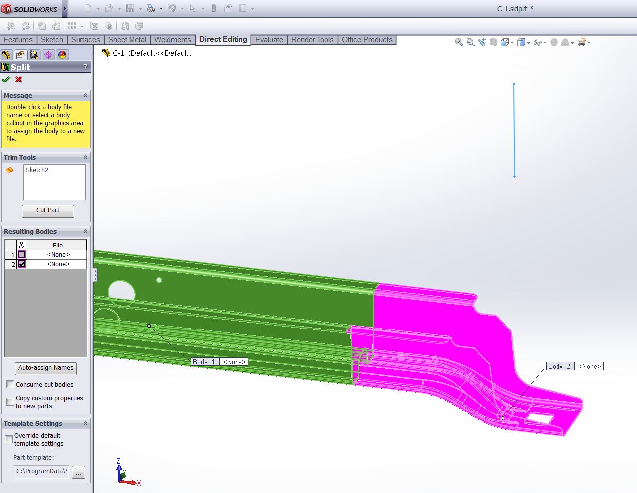 At this stage I try FeatureWorks for feature recognition but the results don’t give me what I require. As the part is a solid body I use the “Split” feature and make it into “Multibodies” (two solid bodies)