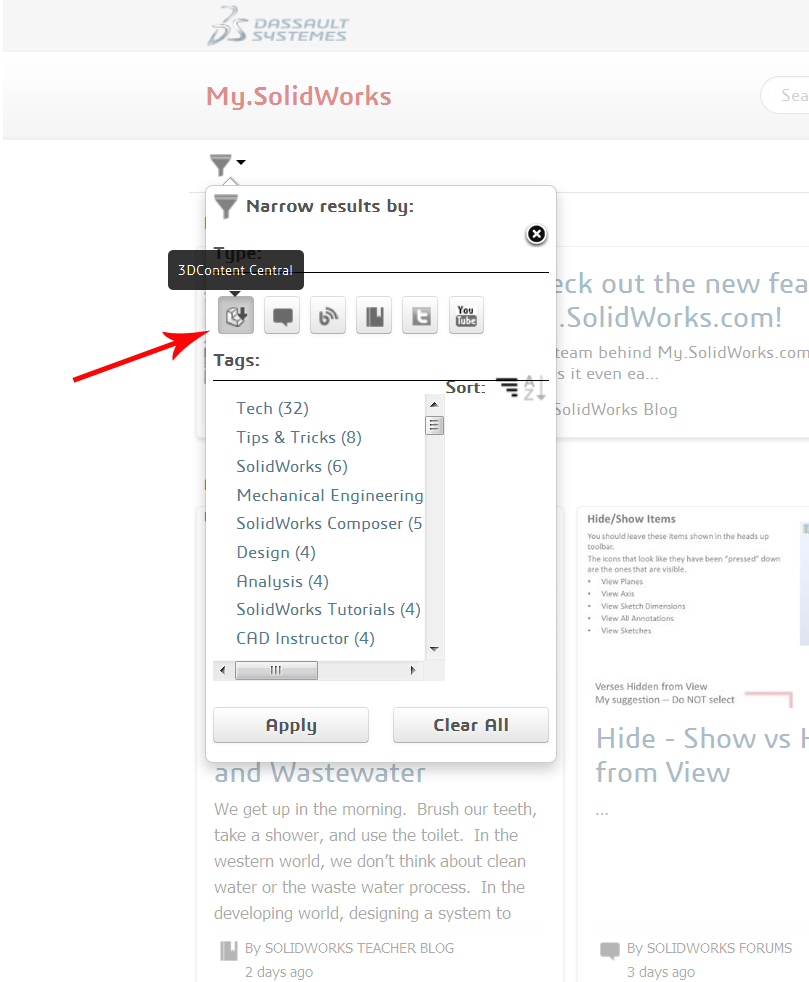 You can also filter for 3D Content Central, Select the Filter, Select 3D Content Central and Apply
