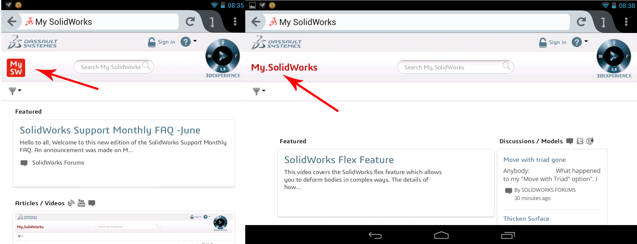 The image on the Left shows the Nexus in Portrait mode and displays the MySw icon. The image on the Right is in Landscape mode and shows the My.SolidWorks icon. At first I thought this was just another one of those curious things and kept myself entertained rotating between the two, just for my own amusement! However it appear it is the telltale sign of the different sizes and displays. In Portrait mode there is no Discussion/ Models column on the right. (more of that later) You have to scroll to the very bottom of the Featured column to locate the Discussions.