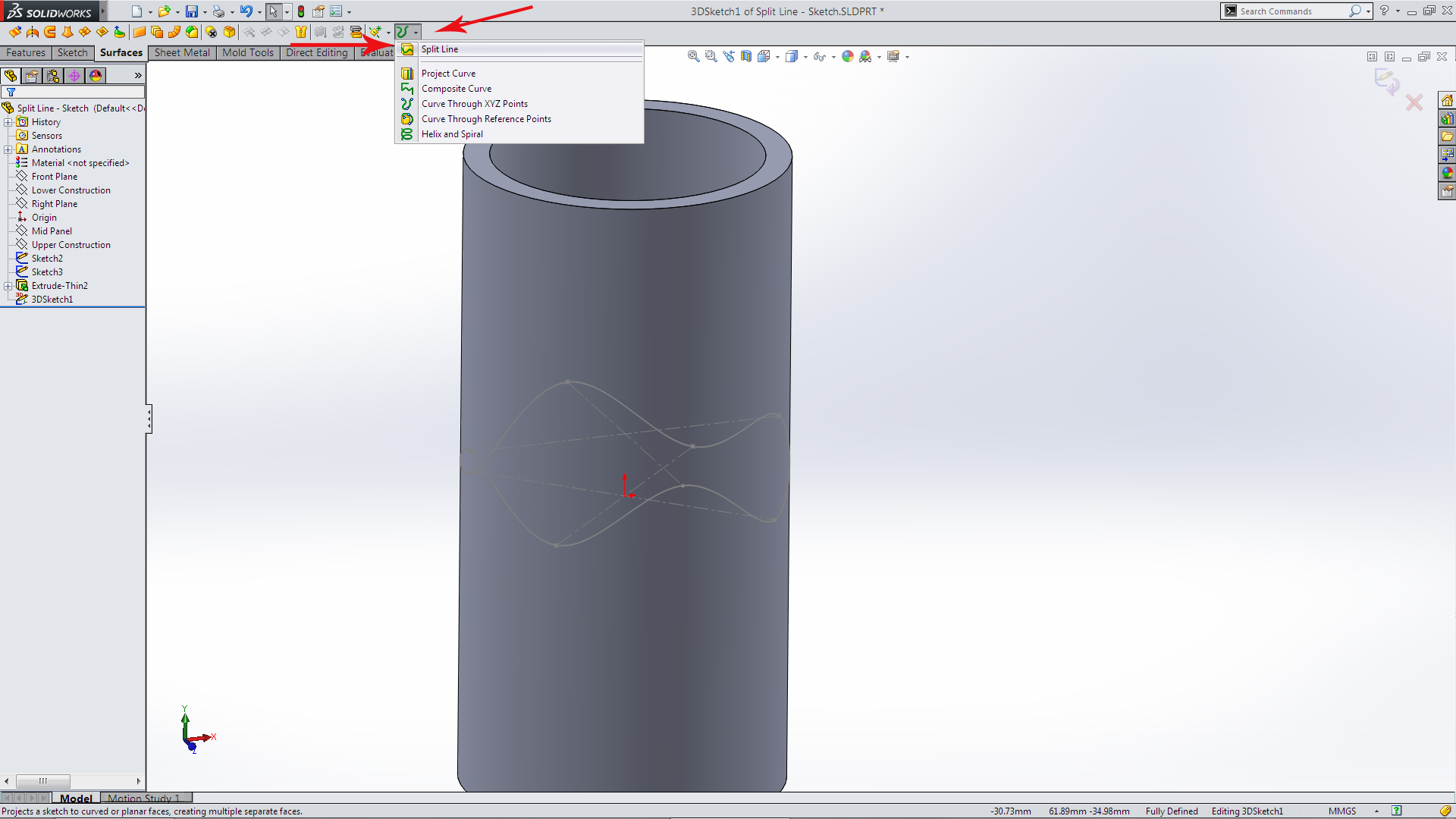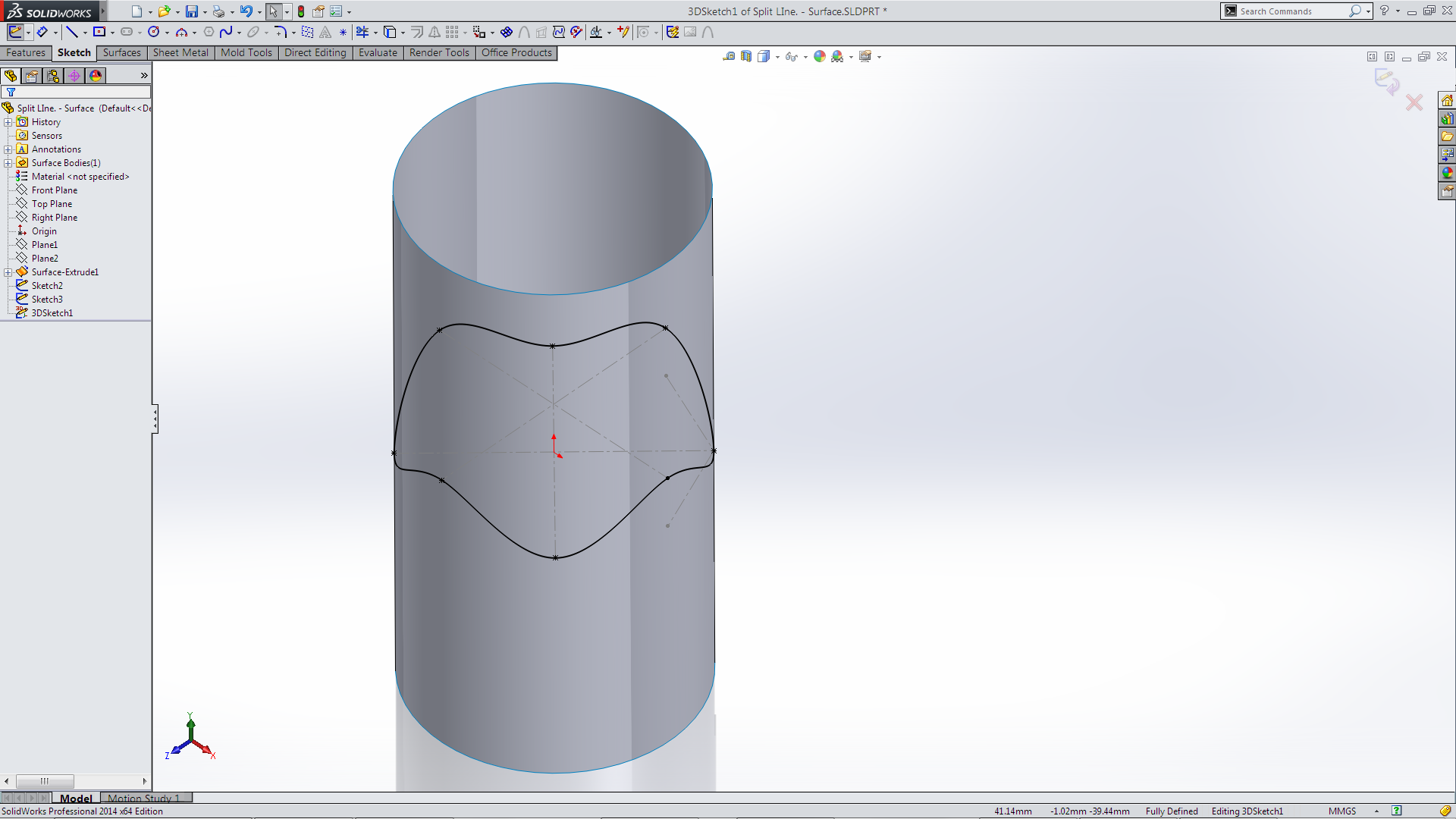 Which creates a fully defined sketch on the surface of the cylinder.