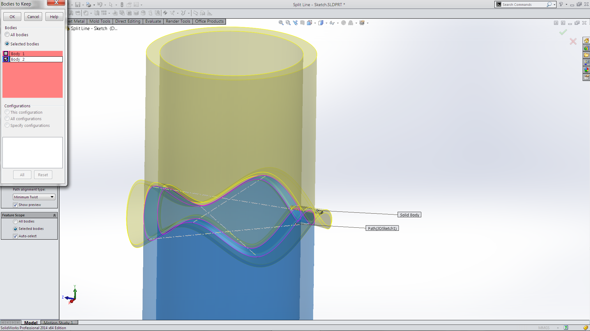 When it cuts it will create two bodies. Select which body to Keep from the Keep Bodies dialogue box.