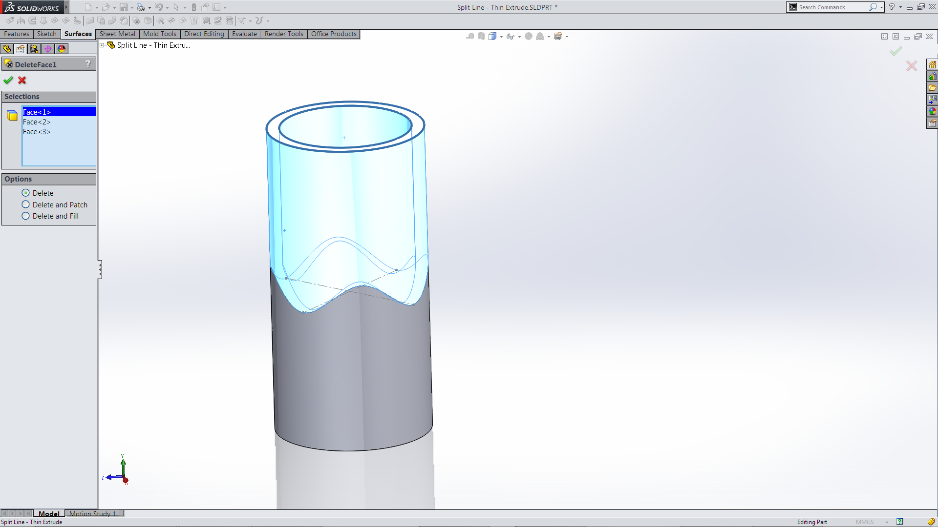 Split Line the Surface. Delete Face, outer and top faces. Not what I wanted so I added the bottom face.