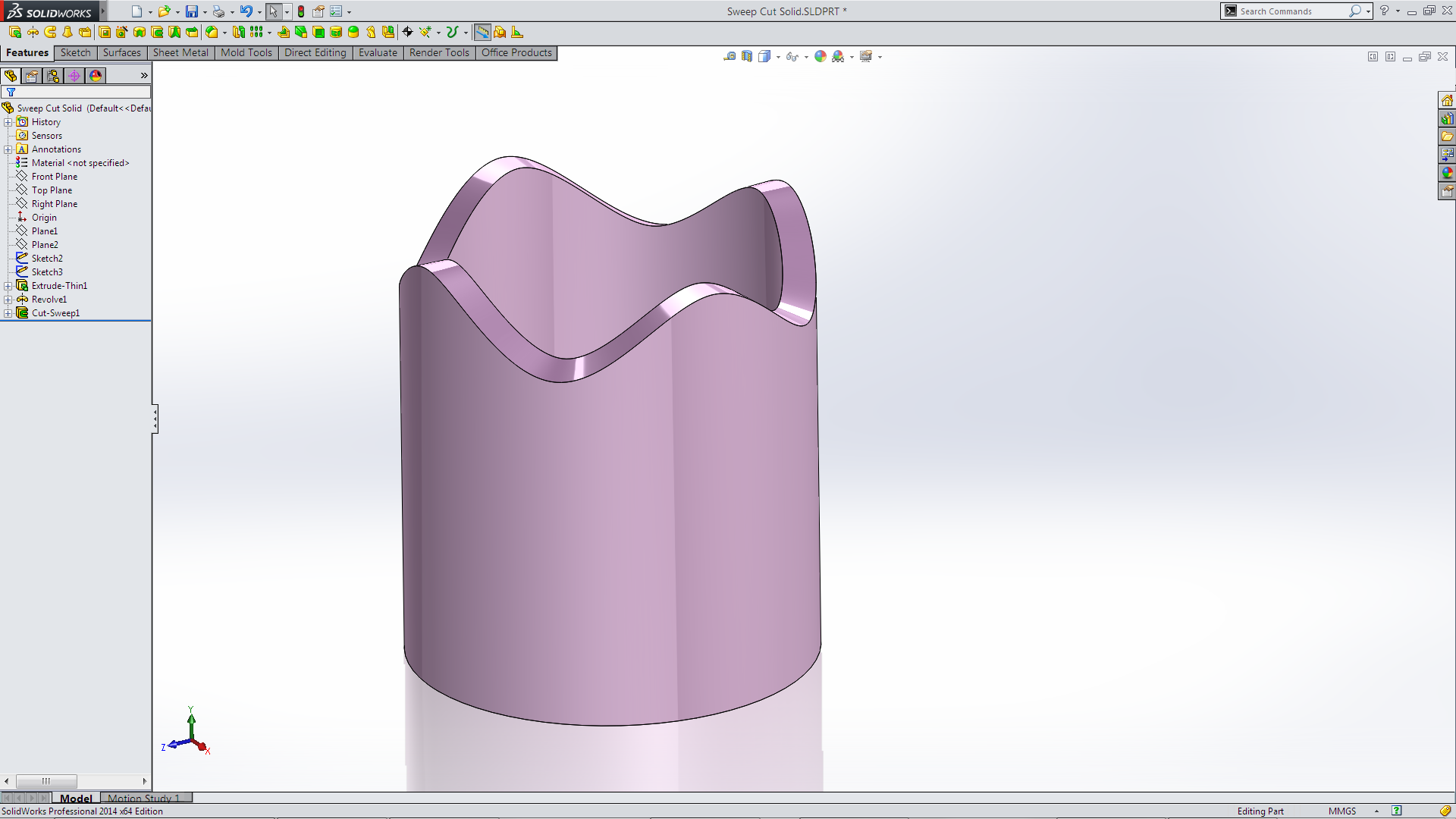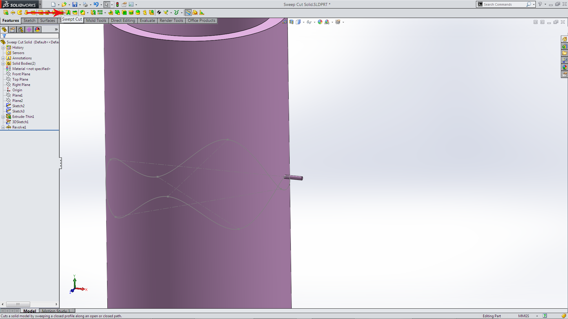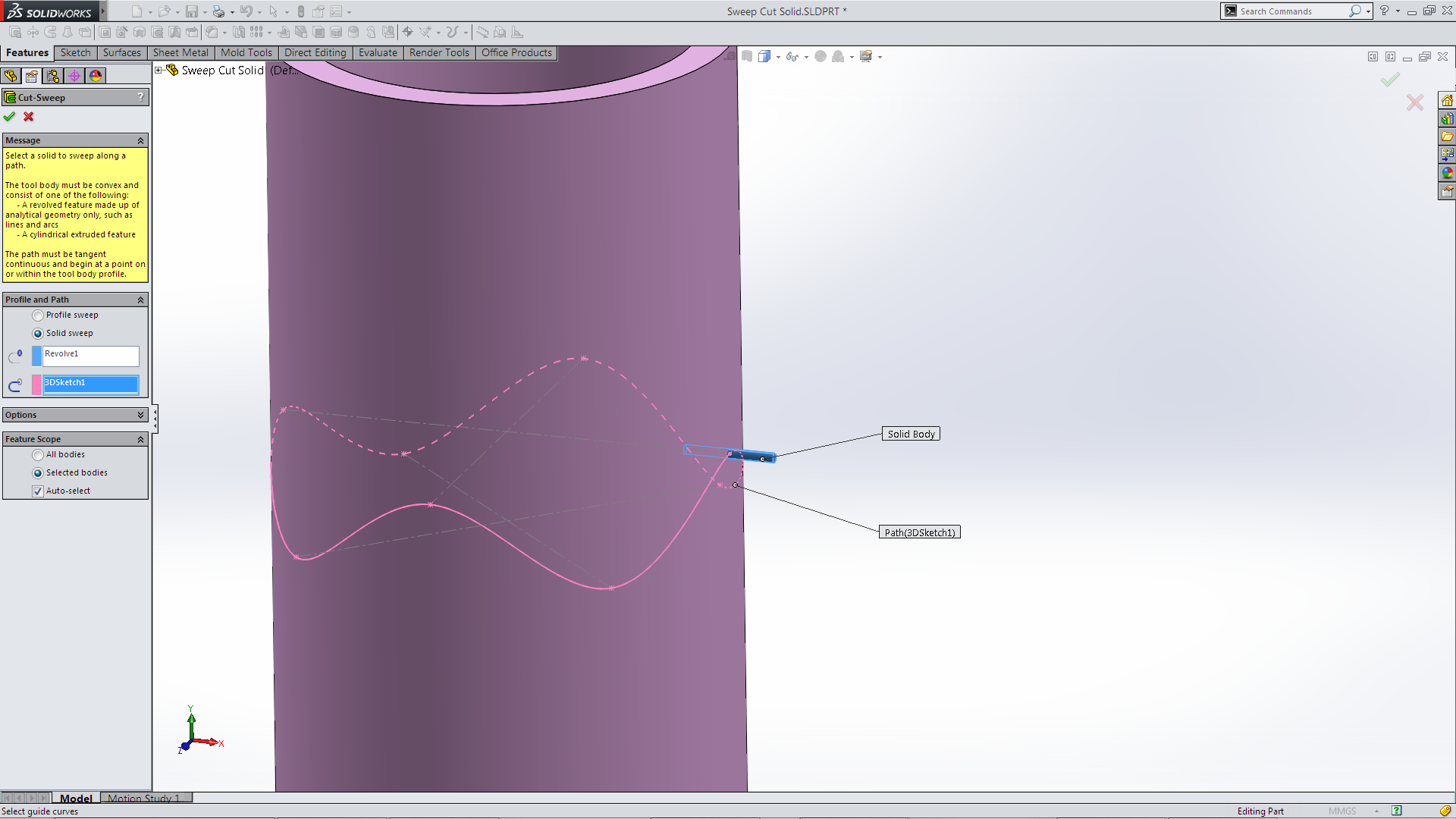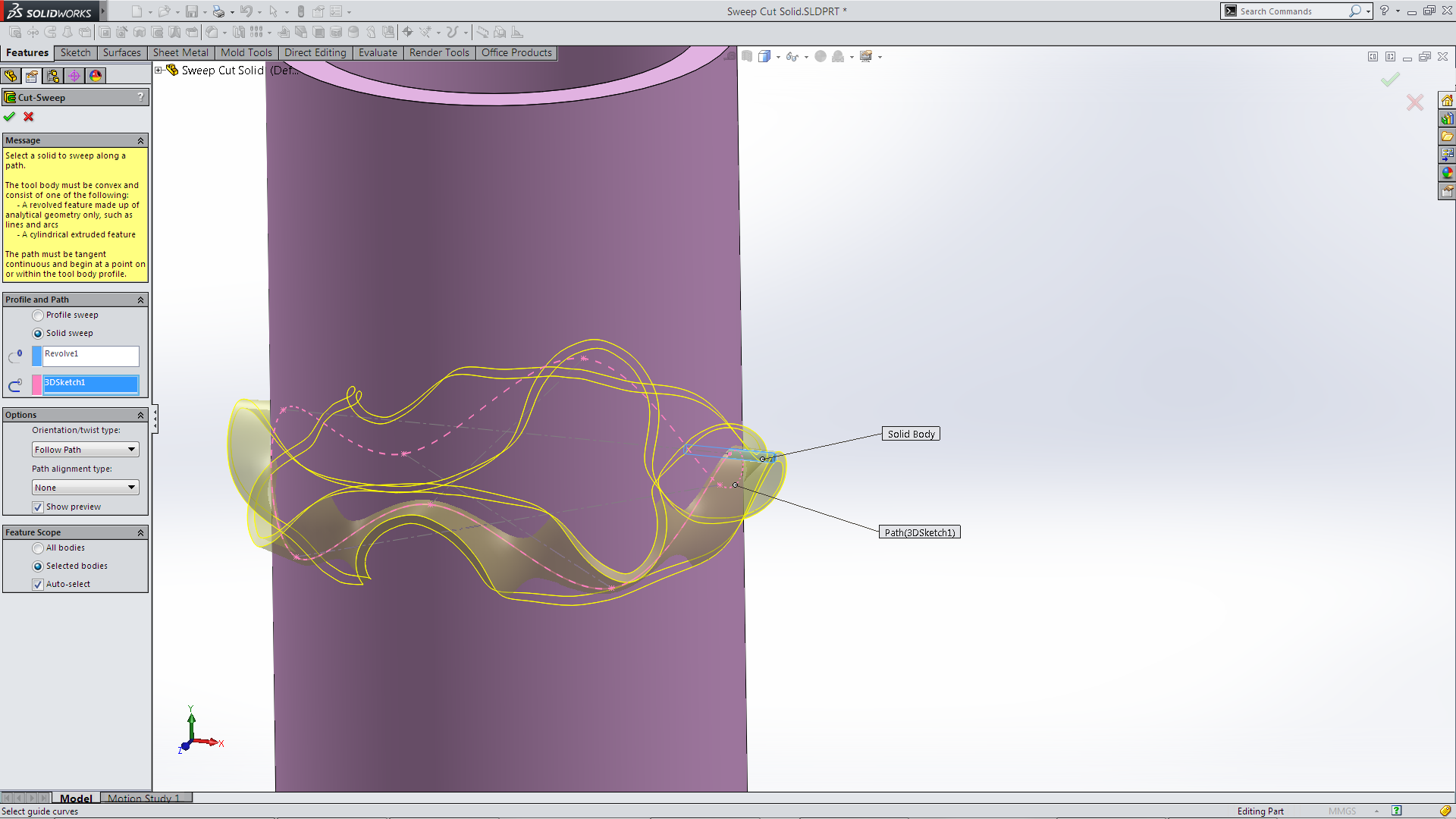 Select Cut Solid Body, select the Solid body (revolve) and the Path sketch