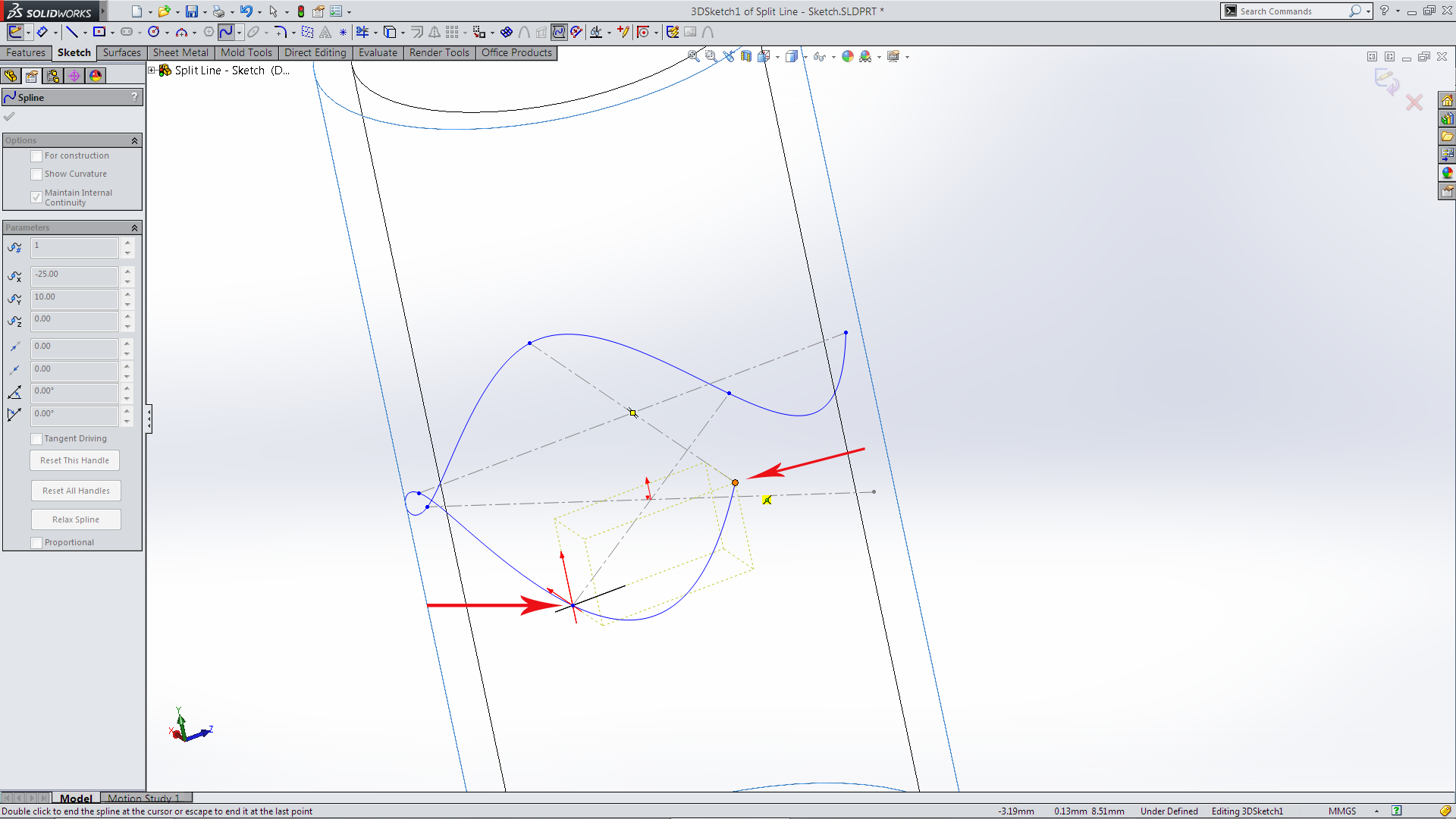 I now used a feature that I have only ever seen shown before but never used – Spline on Surface. The Spline on Surface sketch tool is not standard on the sketch tool bar. I accessed by selecting 3D sketch, Right Mouse Button the viewport which brings up the Sketch Flyout toolbar. Or if you place the Spline on Surface tool on the toolbar by selecting it, it will automatically start the 3D sketch.