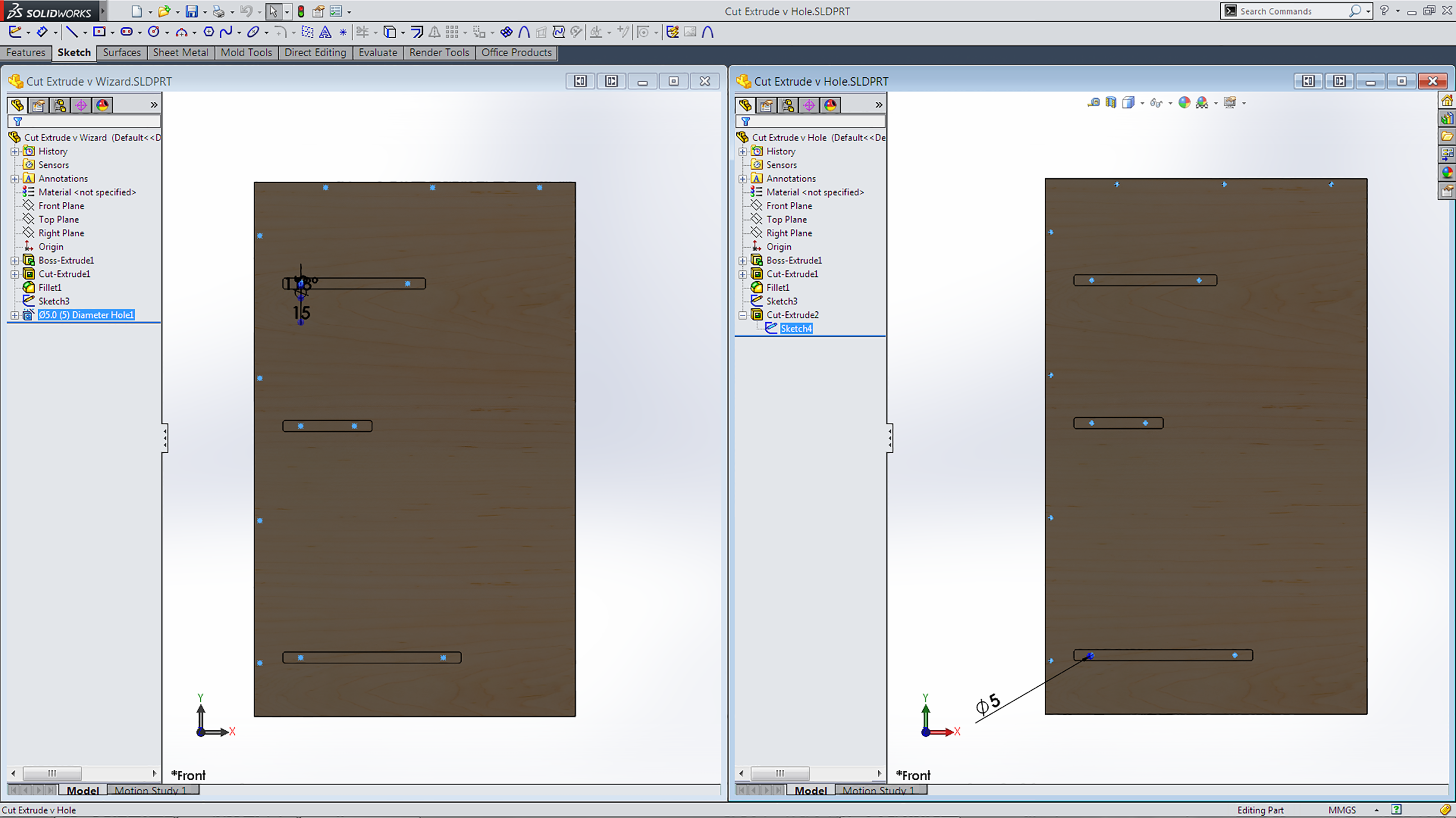 Over the years I have swung back and forth between using Cut Extrude and the Hole Wizard for the screw holes in our cabinet parts. Currently I’m back using Cut Extrude!