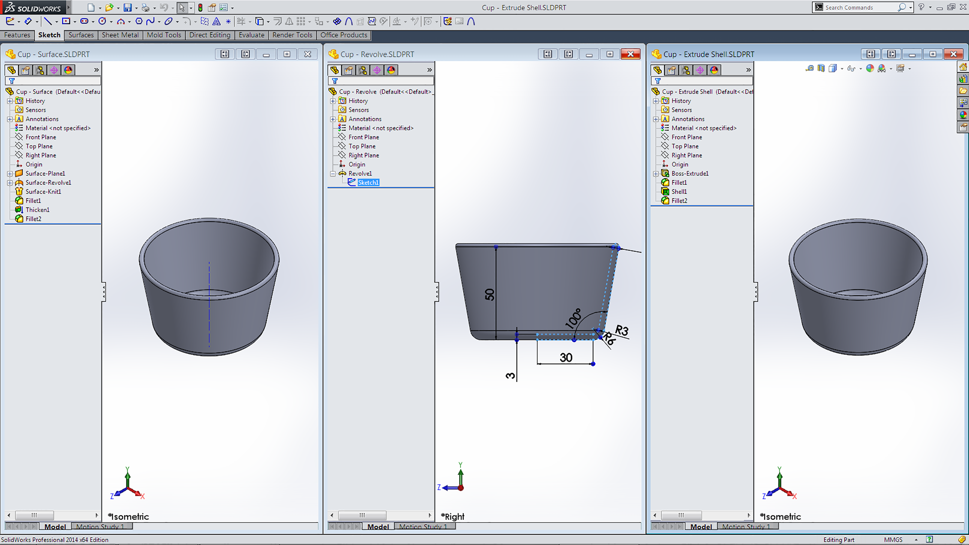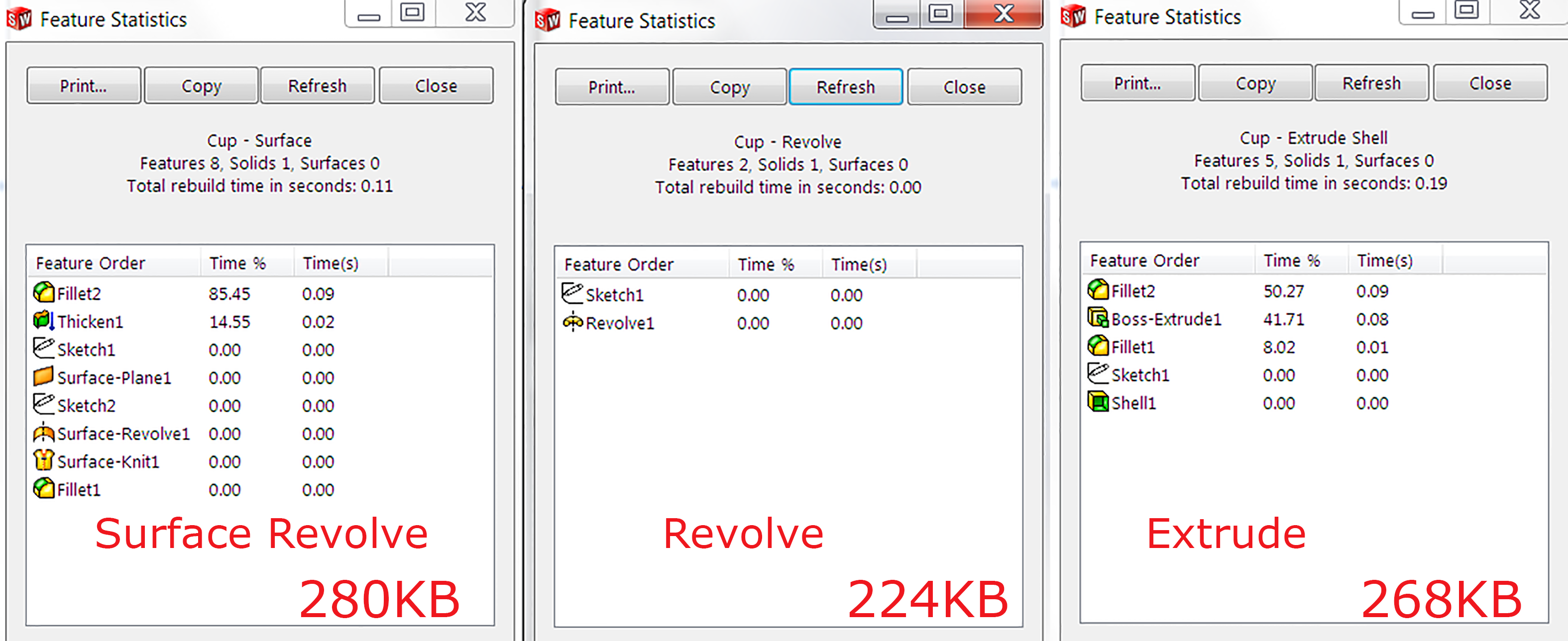 The Extrude / Shell had an increase of 19% in file size and the Surface Revolve a 25% increase in file size. Interestingly the Surface Revolve model has a 42% Saving on the rebuild time.