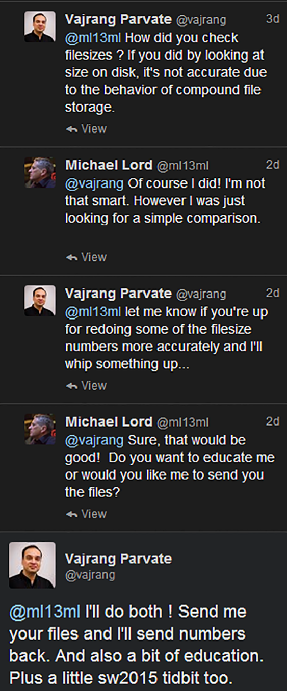 As you can see there was the question in regards to where I was taking my file sizes from. The simple answer was what I could see on the disc. Vajrang generously offered to look at the files and educate me (the latter not always that easy!) So here is the educating part. The file size we see on the disc is more than just the “model” size (the raw data) it comes with “overhead”. That can vary depending on how the file is saved (Save v Save As) or where (local disc v network drive), the type of data and the list goes on! (I can see a whole other post in this!)