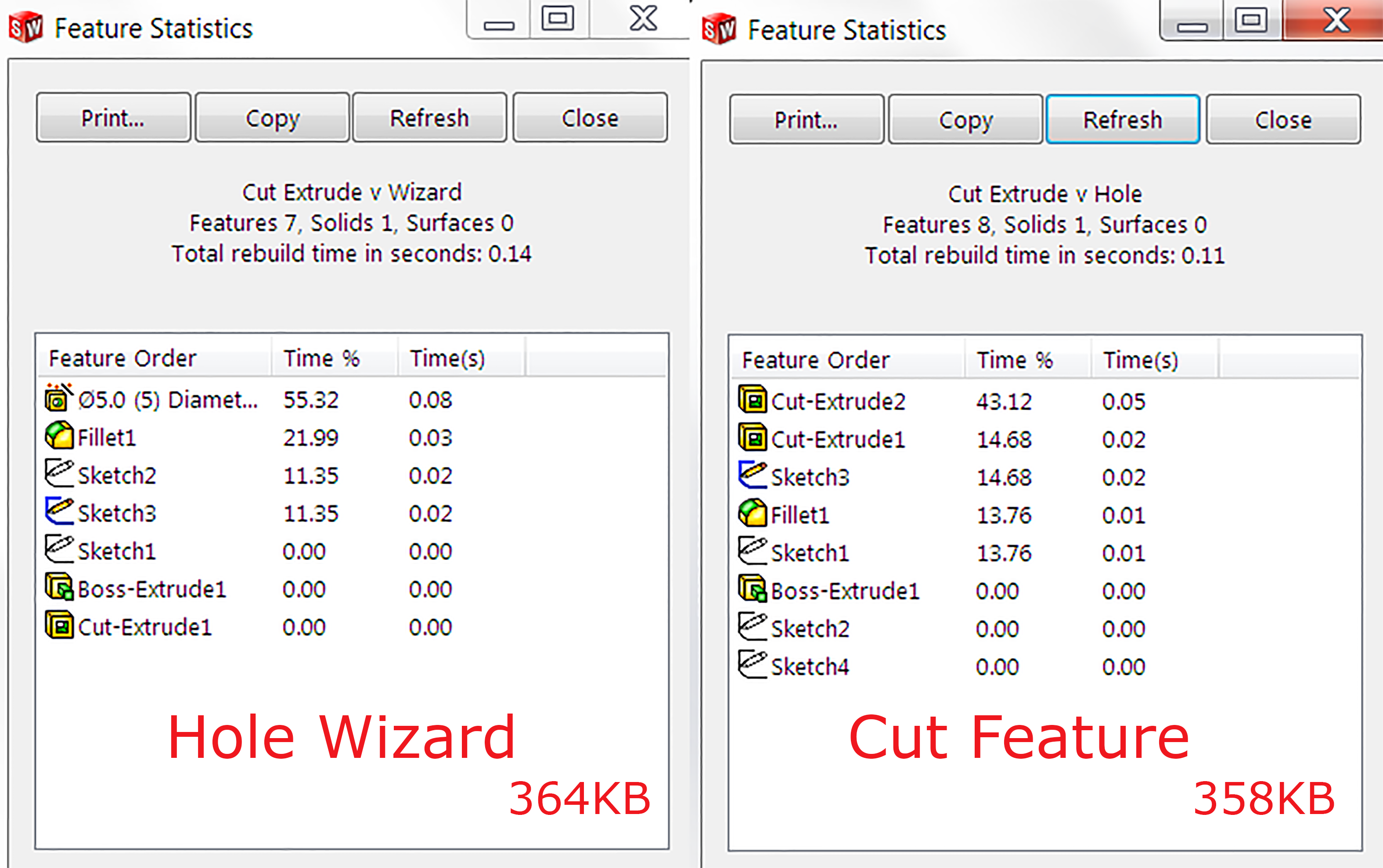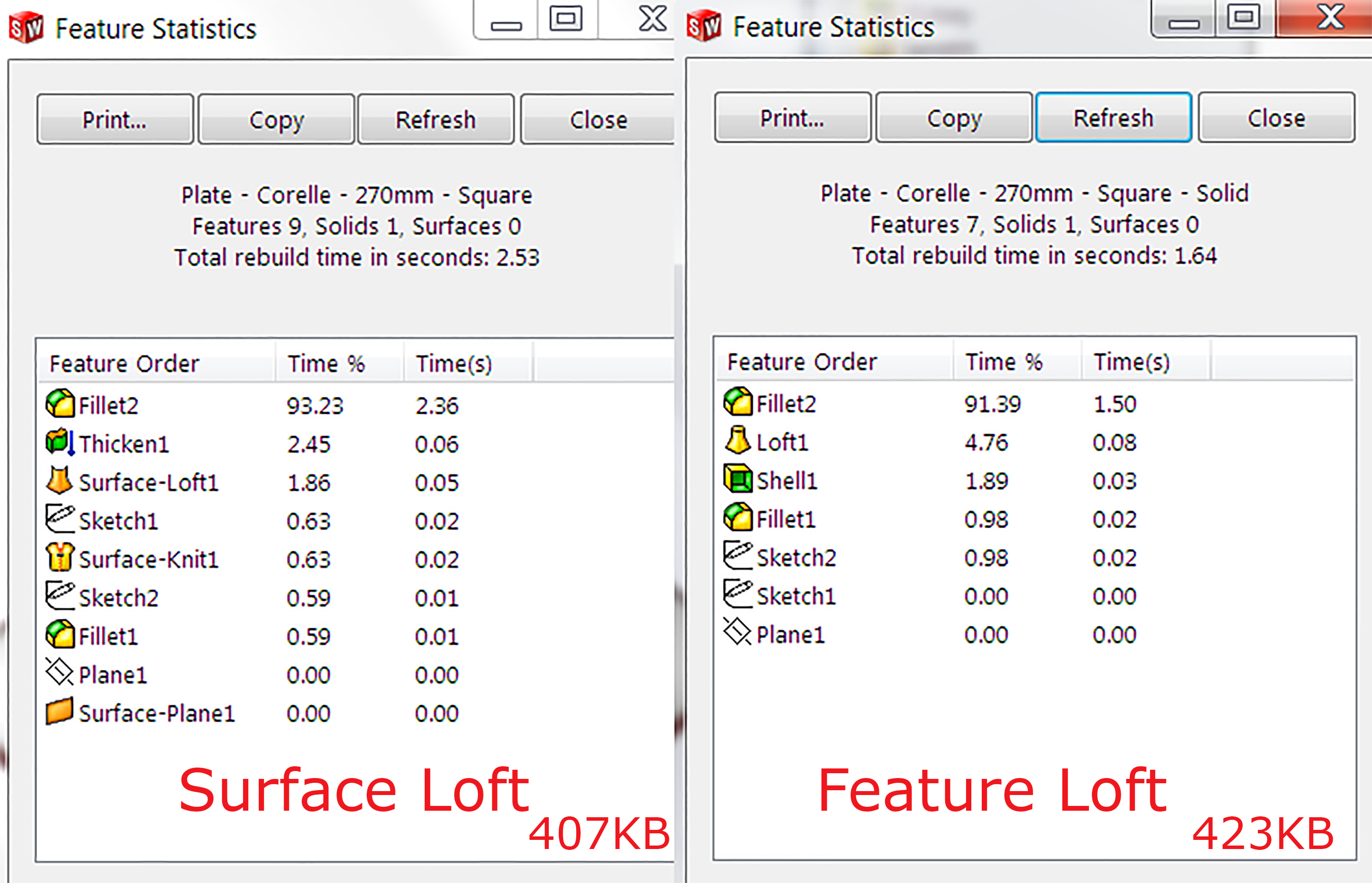 The Surface model had a very small saving of 4% in file size but a some what surprising 54% increase in rebuild time. However what was more interesting was that on both models most of the rebuild time was in a Full Round Fillet!