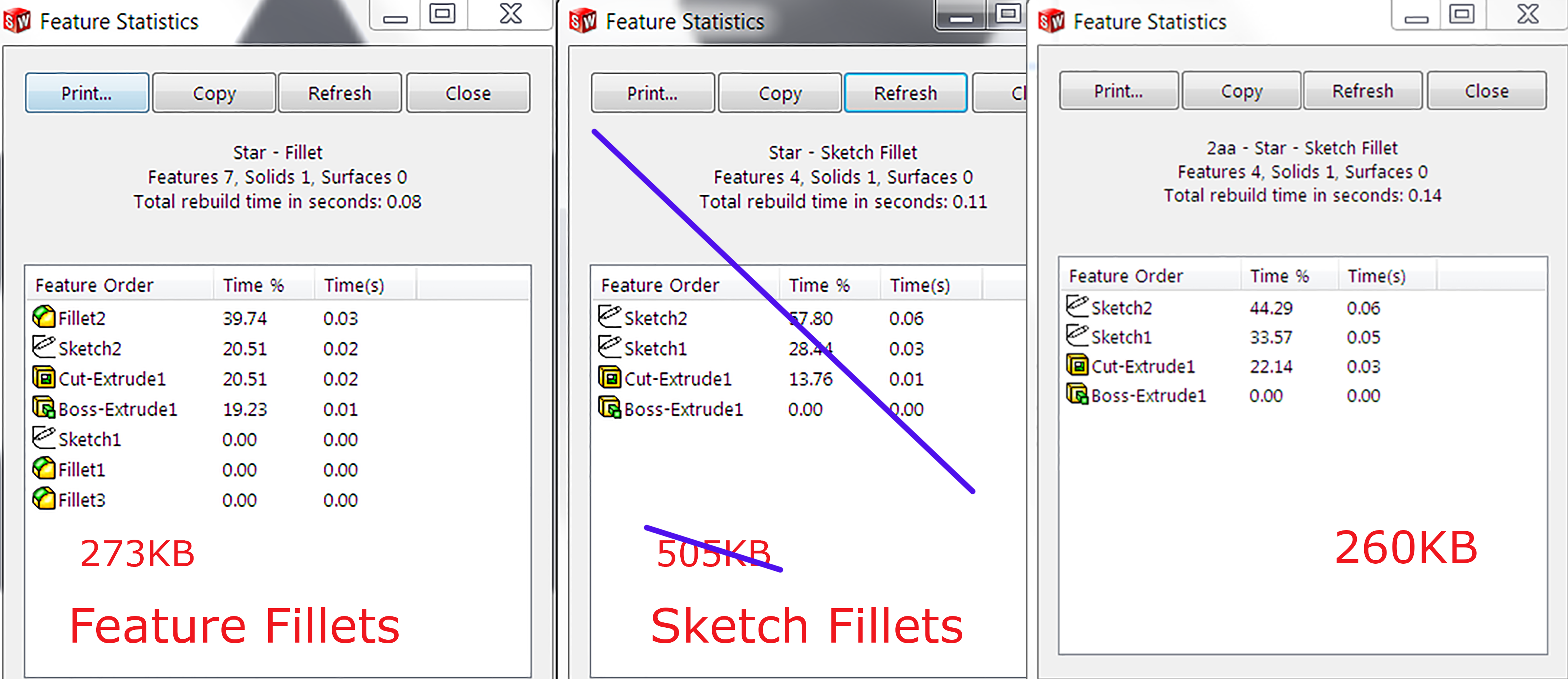 The increase in file size using sketch fillets is 84% with a 37% better Rebuild time.