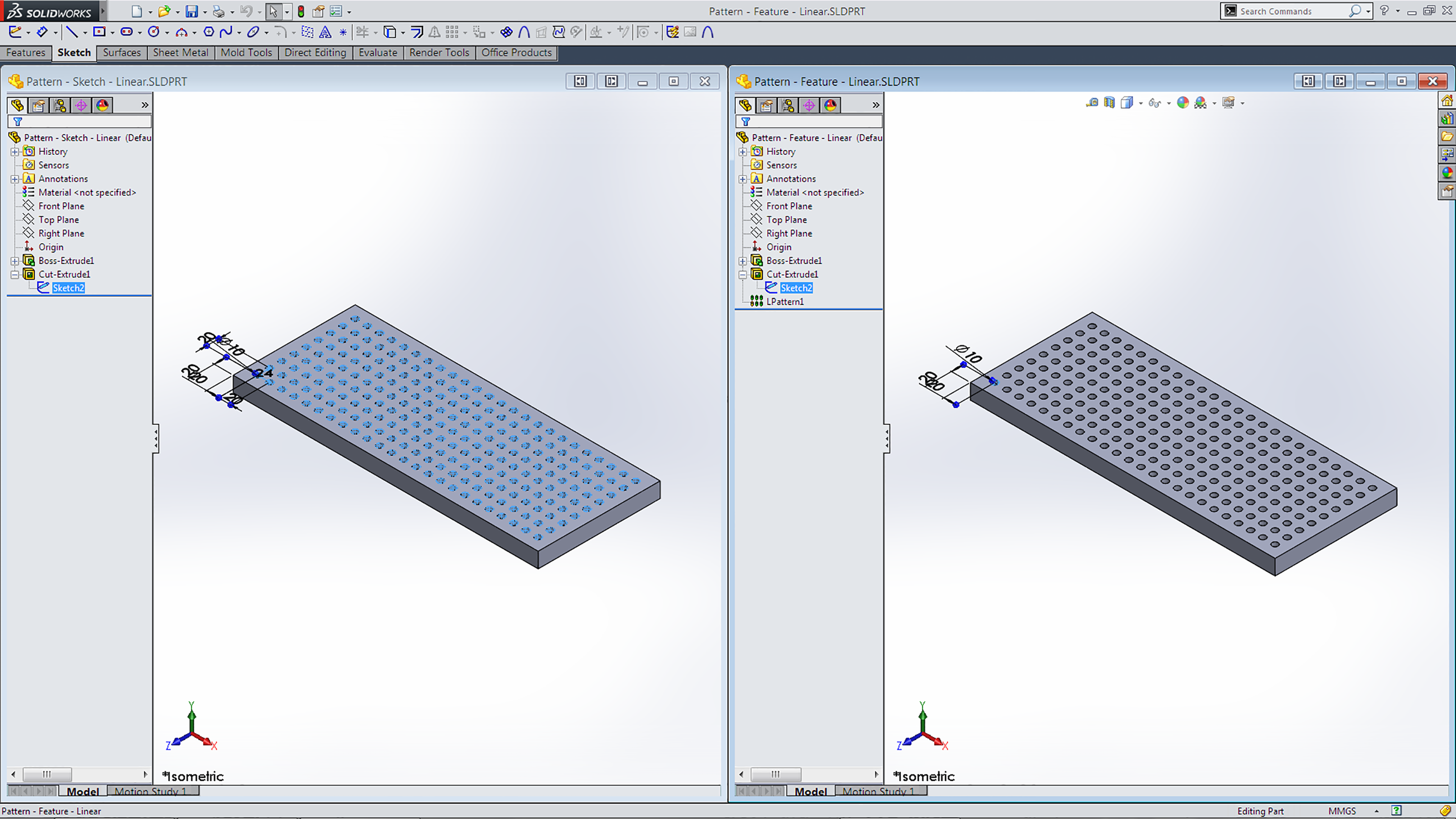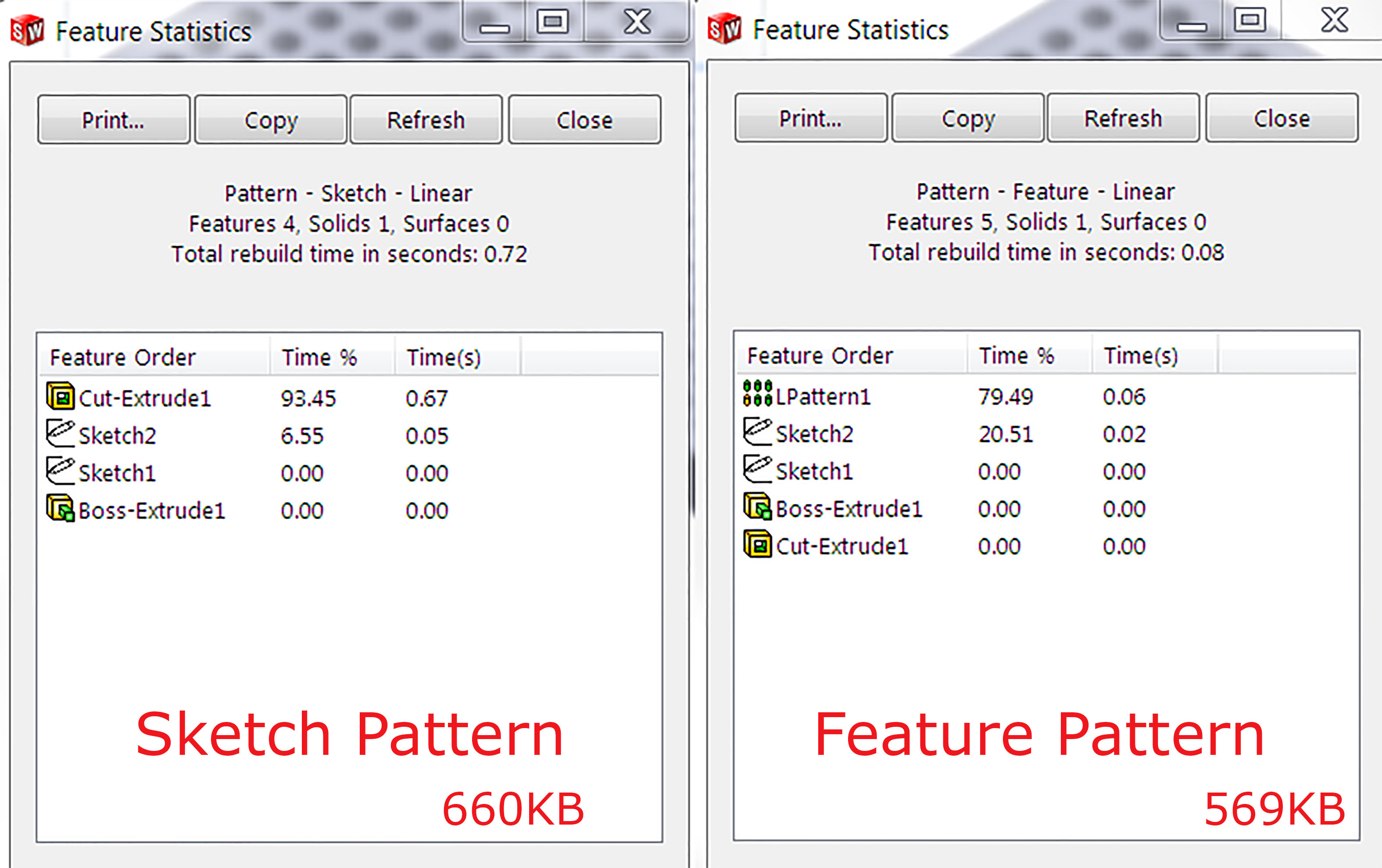 Another comparison using Sketch Pattern V Feature Patterns. I must say I can’t remember ever using (or needing to use) Sketch Patterns. This example looks to be a good reason to keep not using them.