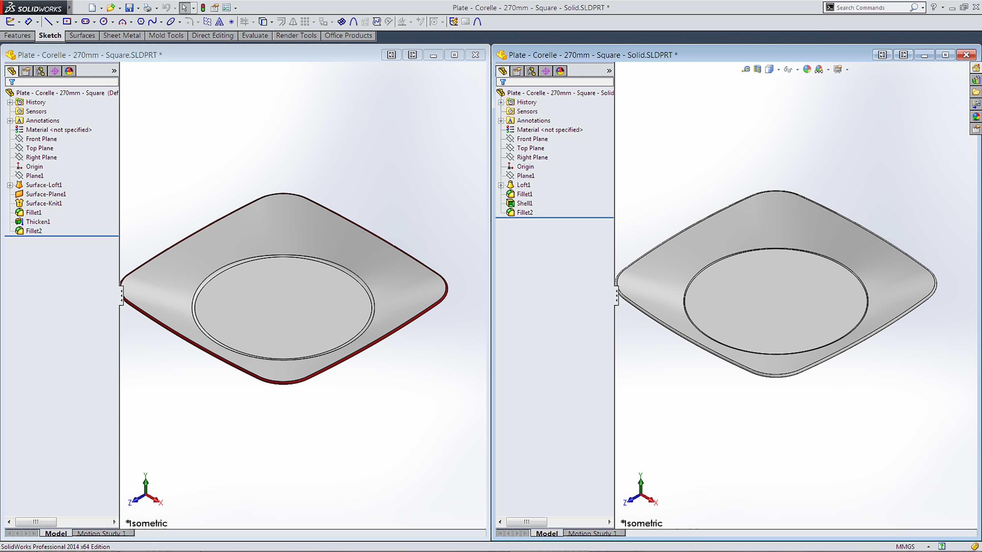 A simple model created with a Surface Loft and Thicken compared to a Solid Loft and a Shell