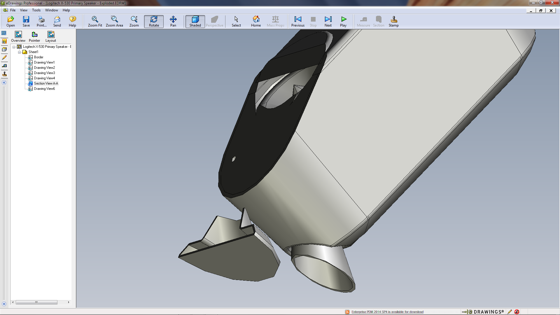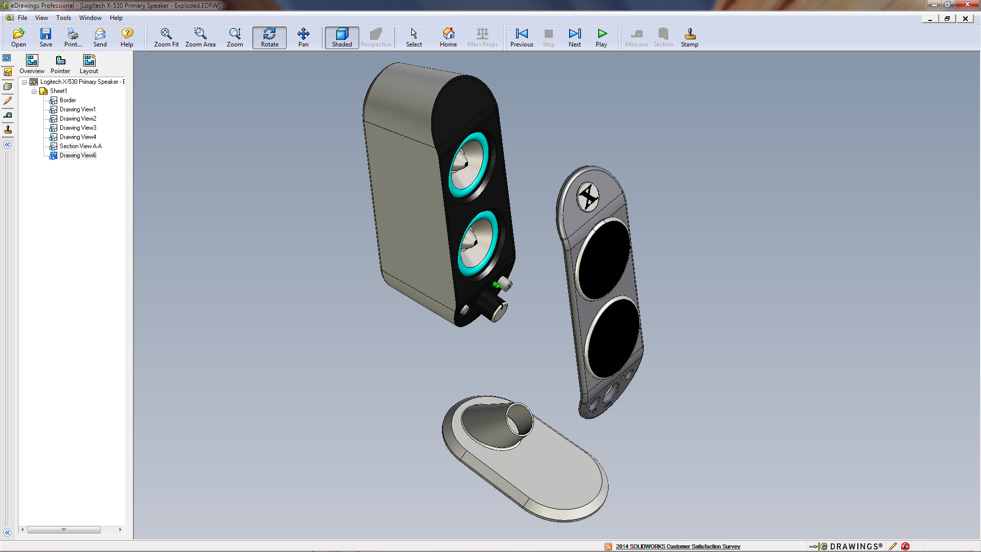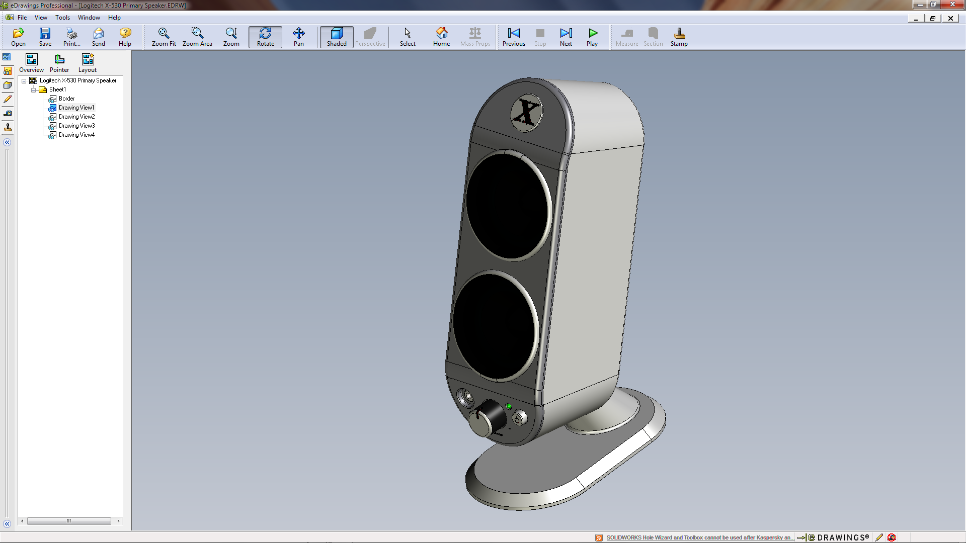 The first thing I had to do was see how (and what it did) to rotate a view in eDrawings. That meant first creating a SolidWorks Drawing. (I had the Logitech Speaker which I downloaded from Charles Culp – SWtuts (SolidWorks Tutorials) the other day in readiness for some computer Benchmarking – buts that’s another story) By the the logo it looks as if it’s a Rob Rodriguez – Axis Cad Solutions model!