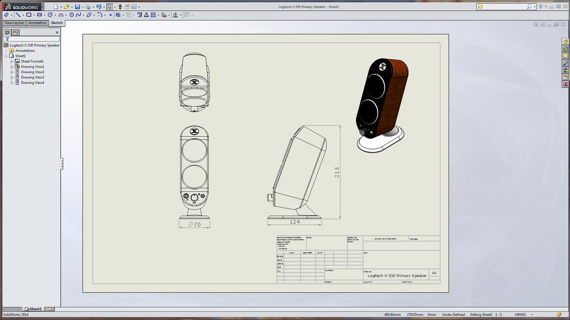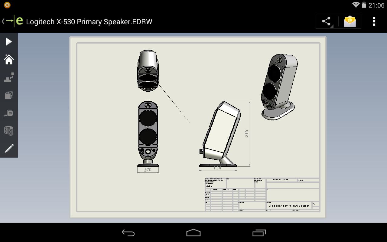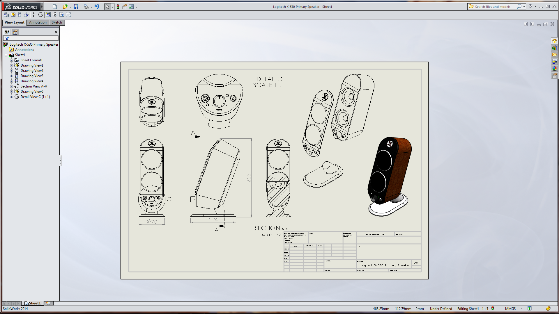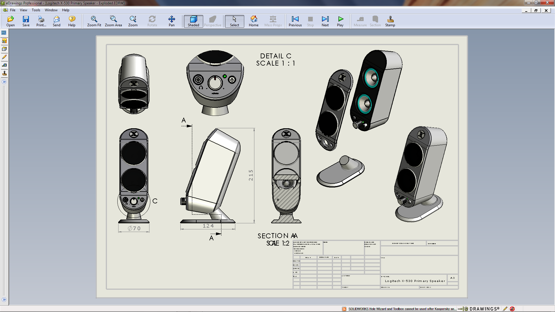 The first thing I had to do was see how (and what it did) to rotate a view in eDrawings. That meant first creating a SolidWorks Drawing. (I had the Logitech Speaker which I downloaded from Charles Culp – SWtuts (SolidWorks Tutorials) the other day in readiness for some computer Benchmarking – buts that’s another story) By the the logo it looks as if it’s a Rob Rodriguez – Axis Cad Solutions model!