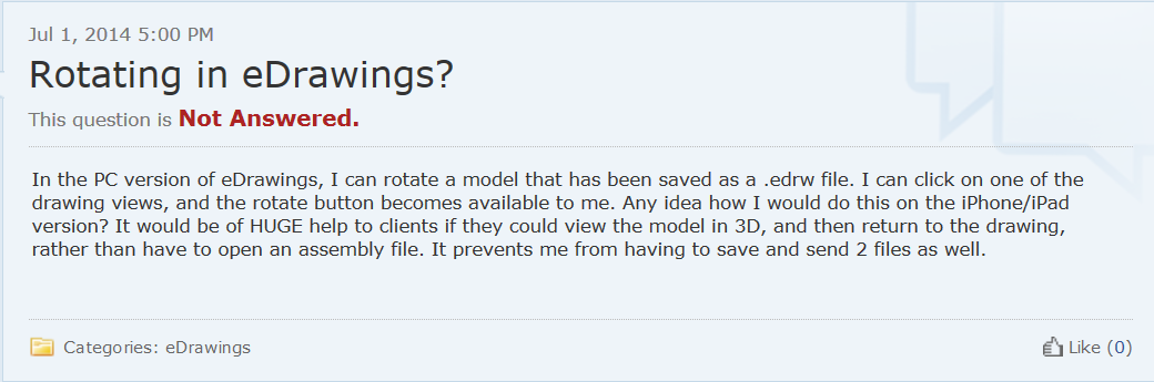 So I shouldn’t have been too supprised, when I didn’t know, after I read that you could rotate a model from a eDrawings EDRW! Who would have thought that! The question was posted on the SolidWorks Forum. It was in regards to rotating a view (model) in a eDrawings Mobile version!