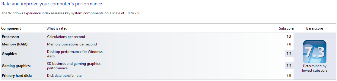 First up was to have a look at the Microsoft Window Experience Performance. Not to sure as to what I was expecting but maybe a little surprised that it’s only a 7.8 (and not a 7.9) for the Processor (Calculations per second).
