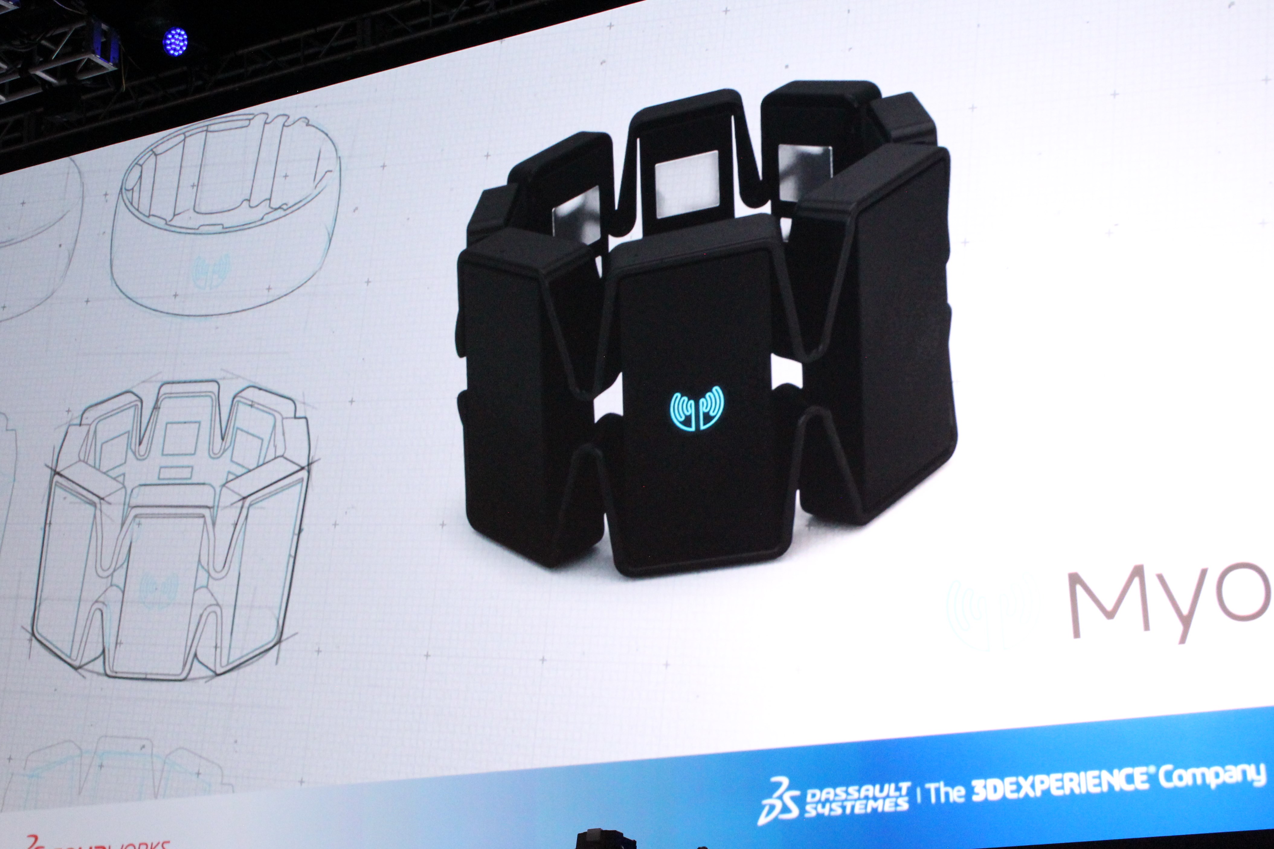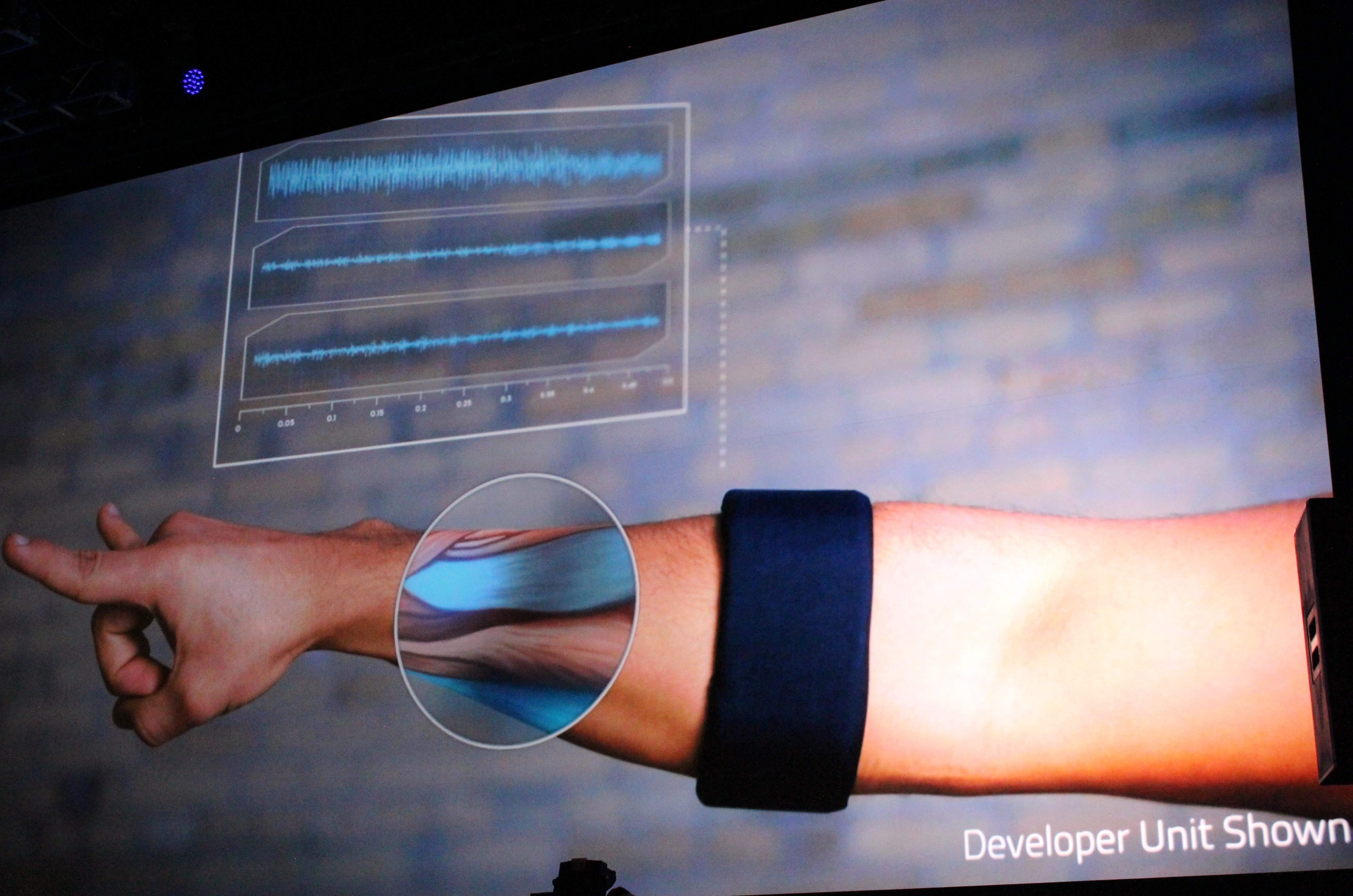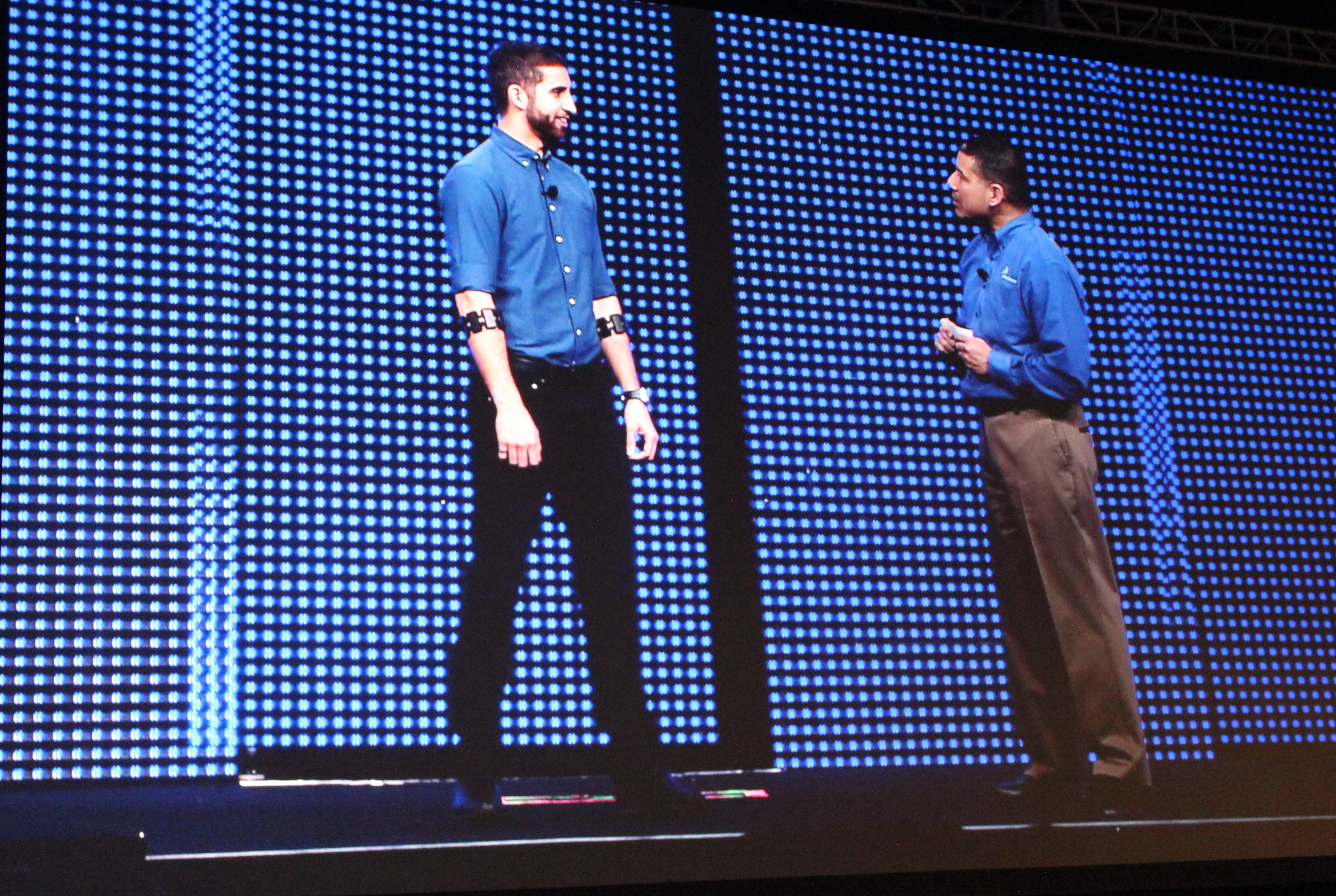 Chris on stage wearing Thalmiclabs – Myo – Gesture control armband