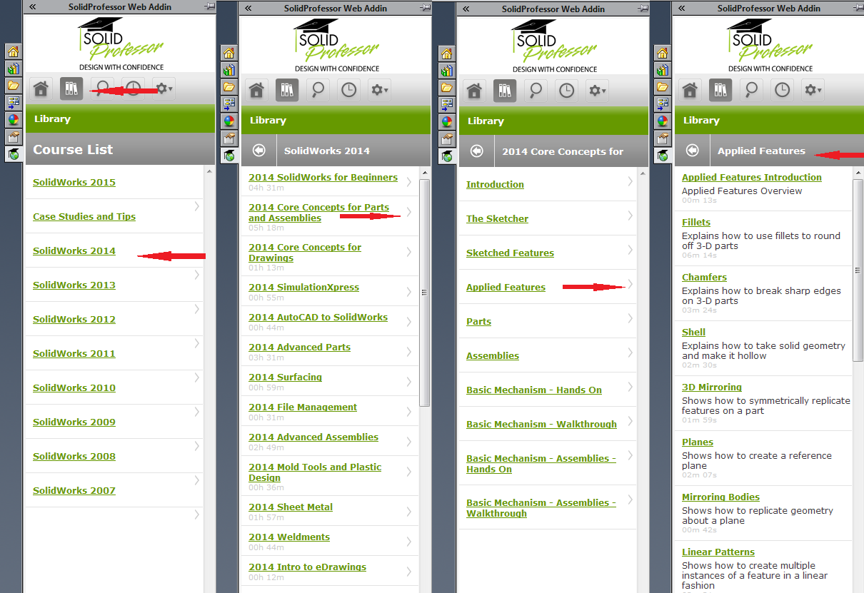 SW AddinOnce Logged In to SolidProfessor (via the Task Pane) you are presented with a series of Menu options.  The Library tab provides access to the Course modules.  Once selected it allows you to drill down through the menus to the – Course List,  release year, Core subjects and Applied Features