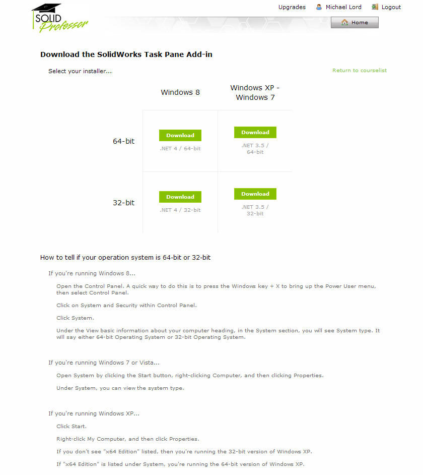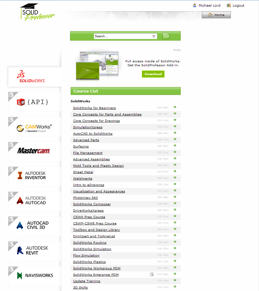 LogInAfter you have logged in you are presented with the Course List and can access the training videos via the website.  However there is a better way that provides access direct from inside of SOLIDWORKS.  One top of the course list is the Download link for the SOLIDWORKS Task Pane Add-InWeb PageSelect the download the Add-In to suit. SoildWorks Add-In