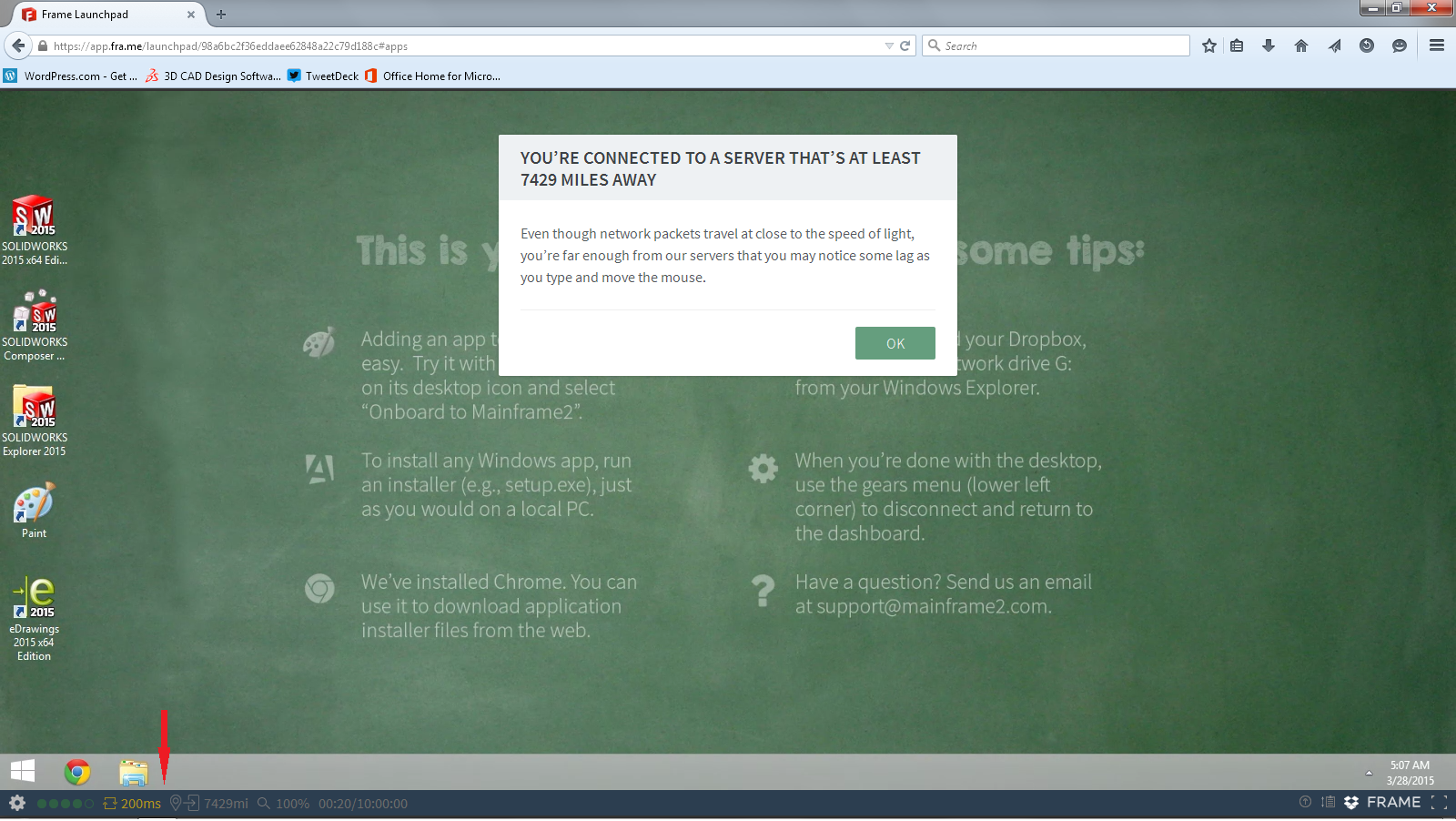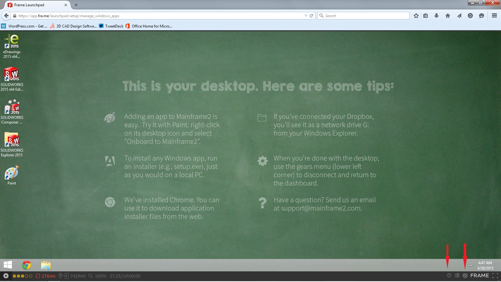 Installation of SOLIDWORKS (and other any other programs) is via the normal “download and install” software system. Chrome Browser is already installed on your “Desktop”. SOLIDWORKS Licensing may be a problem for those not in the USA with the dual “Office” and “Home”install licenses (and using Frame Personal.) Those not on that licensing system will need to “transfer” your license between your computers! Those with Network Licenses and I assume will most likely be on Frame for Business and this wont be a issue.
