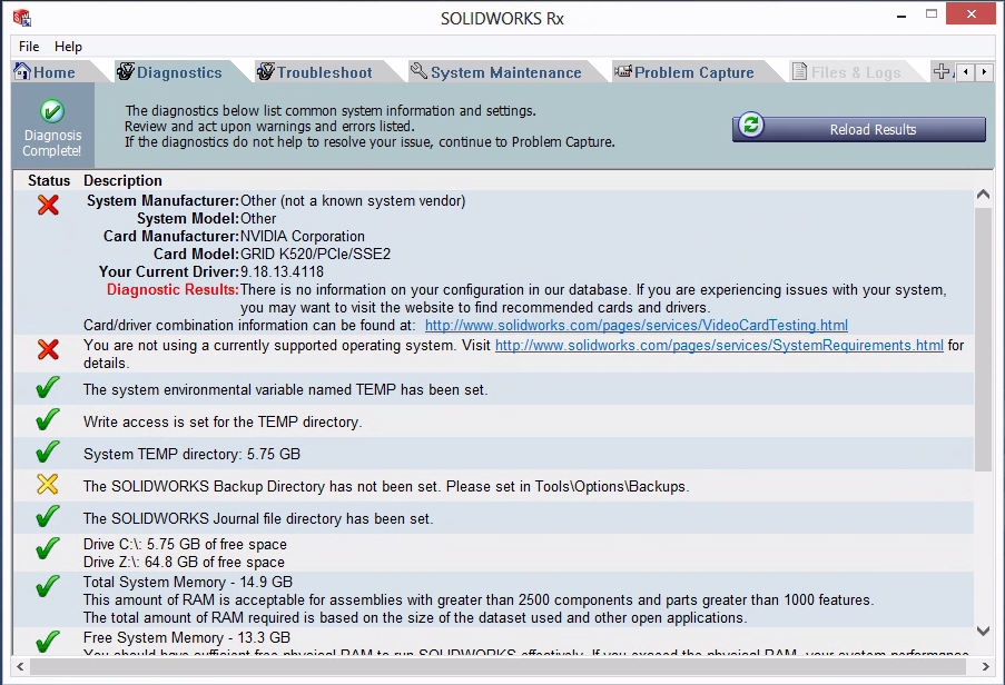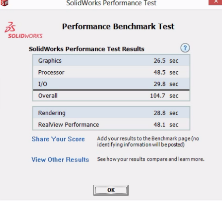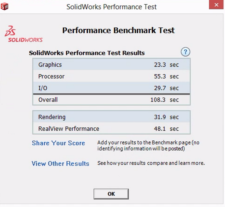 As with all new systems the first thing I did was run the SOLIDWORKS Performance Test. The results were USA Server – Overall 108,3