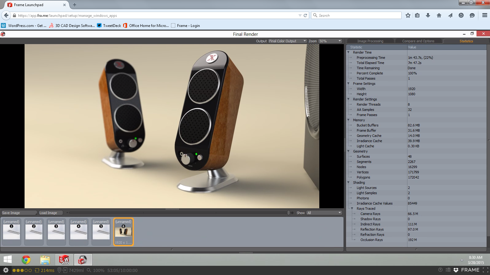 Switching to the Rendering Benchmark (by Rob Rodriguez – Axis Cad Solutions ) “Speaker for Render Benchmark” which can be found on Charles Culp – SWtuts site . Running on the USA Sever it completes the Render in 7mintues/47seconds