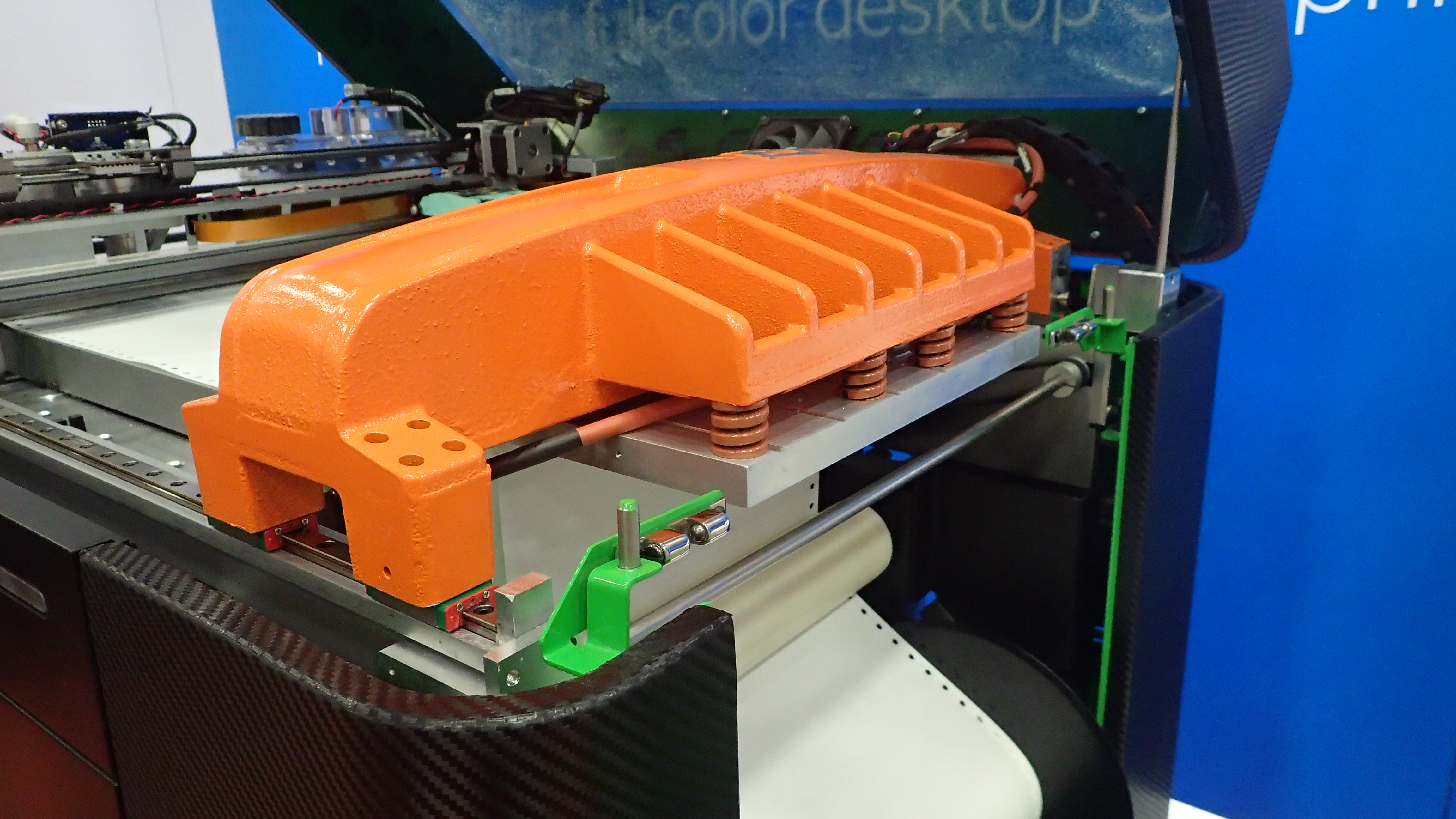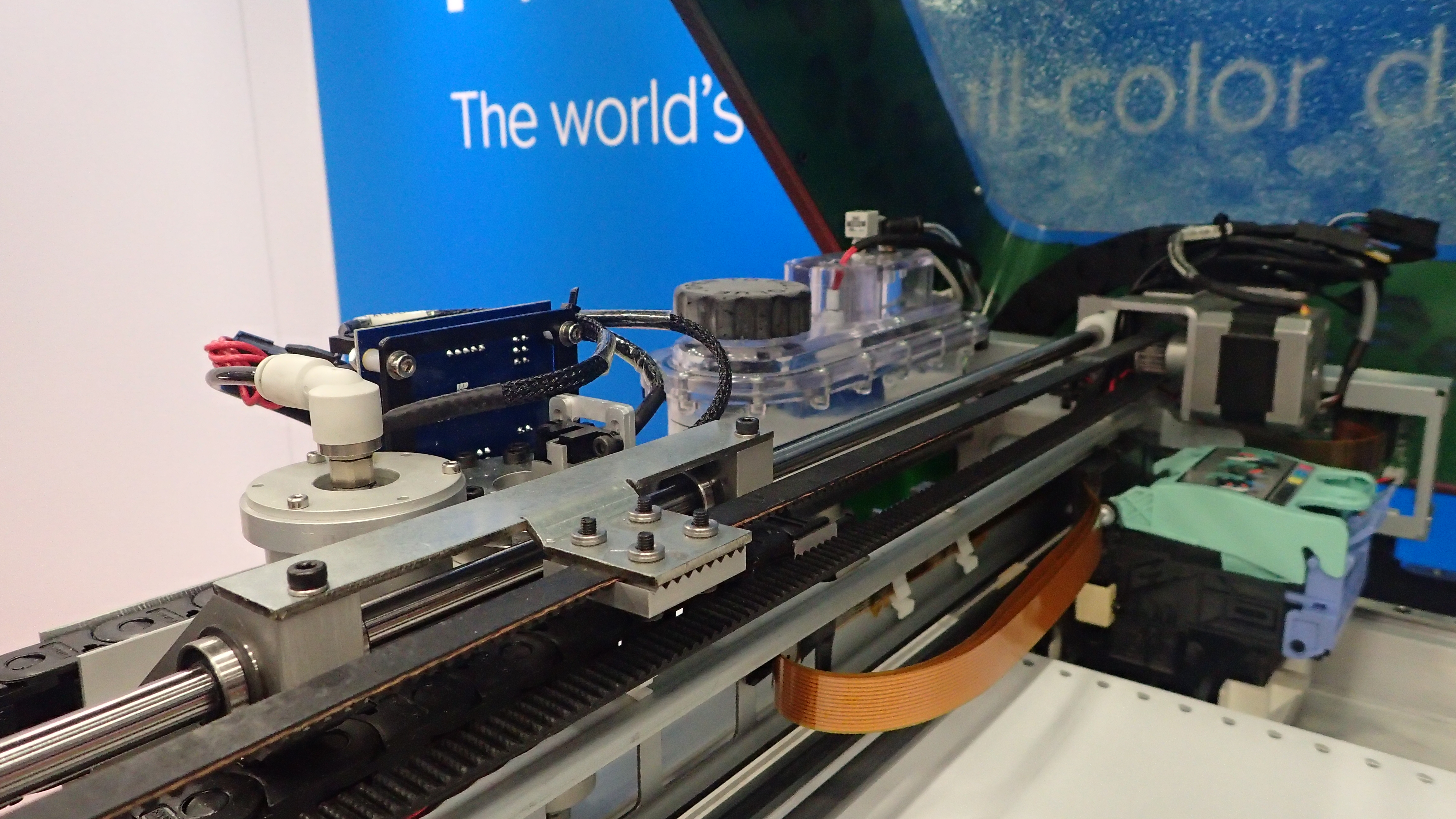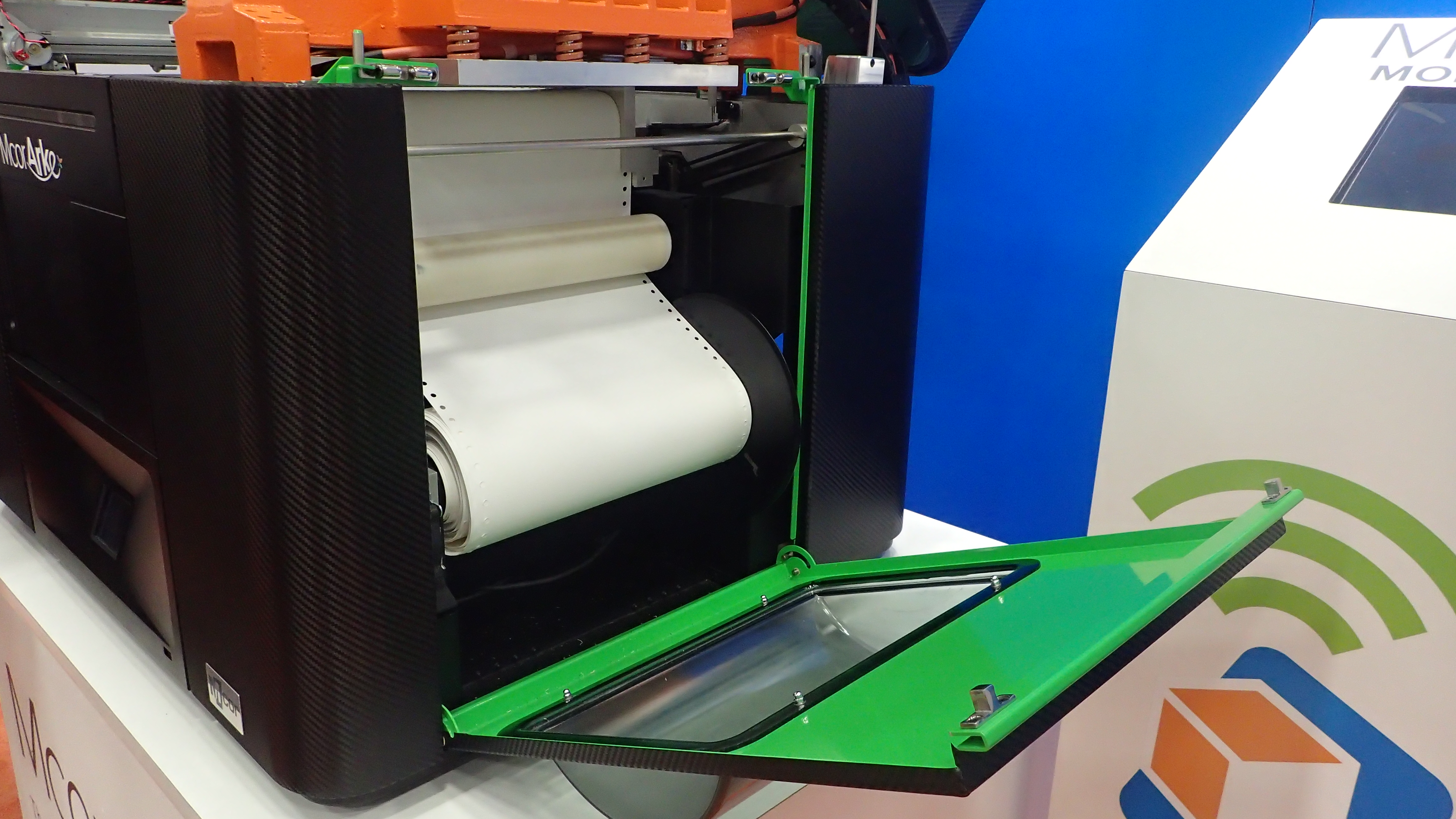 Now all the processes of printing, adhesive application, cutting and pressing have now been moved to the the one area at the top of the printer. Allowing the components to do the moving and apply their process at the one location.
