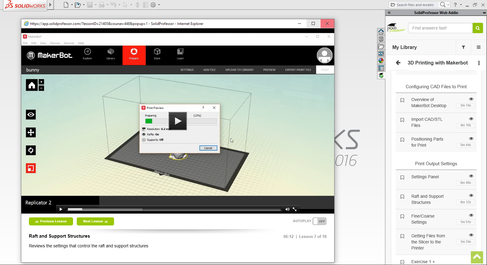 The MakerBot course follows the SolidProfessor proven formula. Training modules of around 3 to 5 minutes in duration. Each providing a detailed step by step explanation of all aspects of the MakerBot Desktop application.