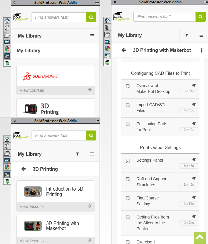Their latest offering is available to those who have access to the SOLIDWORKS (or Autodesk) SolidProfessor training modules and sees a move into 3D Printing. There are two modules a Introduction to 3D Printing with 2 hours of video over 27 lessons, and 3D Printing with MakerBot, with 18 lessons over a single hour.