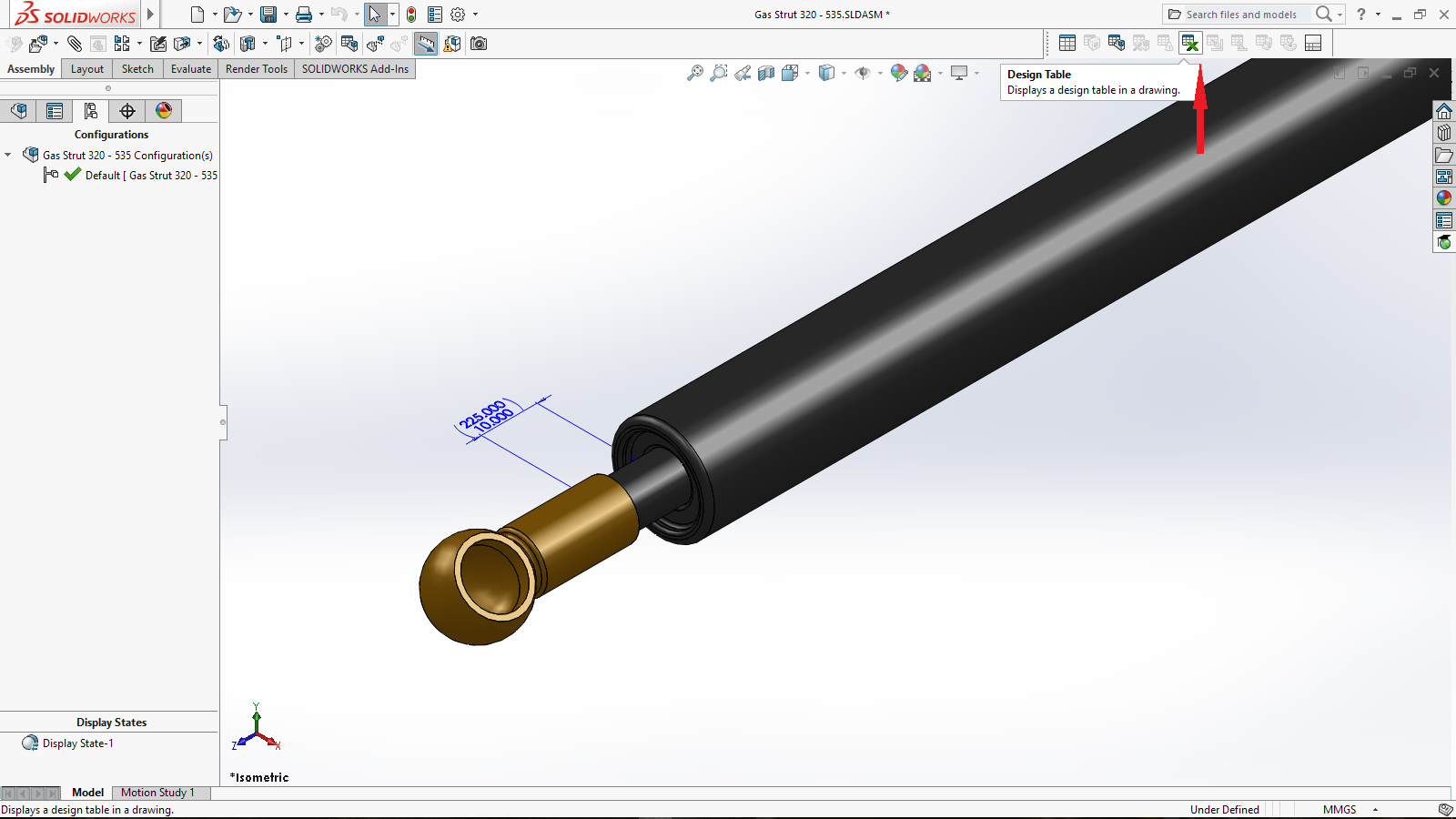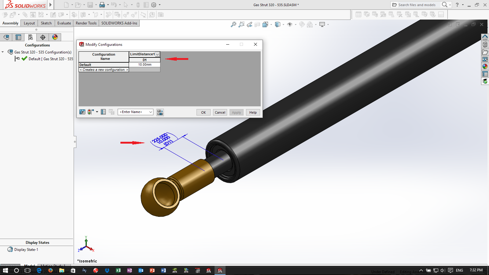 If you show the Limit Mate dimension (You may need to RMB – Annotations in the feature Tree> Select Show Feature Dimensions). Then add a Configuration by RMB on the dimension, then Select Configure Dimension. The configuration table shows the “LimitDistance1”.