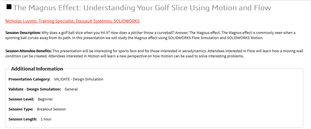 Straight up after lunch I first saw: Sheetmetal Nitty-gritties – Mithilesh Kapre, however it is hard to go past The Magnus Effect: Understanding Your Golf Slice Using Motion and Flow – Nicholas Luyster. Anyone who can combine sport & Simulation in a technical presentation gets my attention