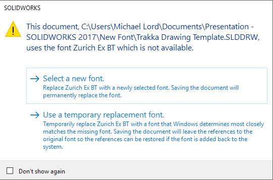 This provides two options. The choice of selecting a new font, which will be a permanent replacement when the drawing is saved. Or SOLIDWORKS 2017 will allow Windows to select a similar matching font on a temporary bases. This will leave the reference to the original selected font, which will then be used if it is added back into the system