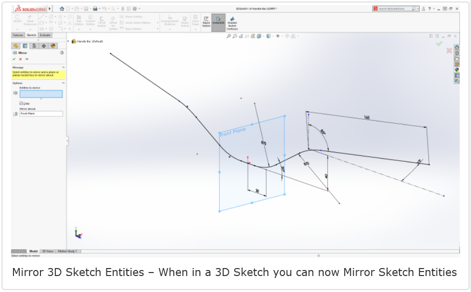 A very promising sketch enhancement shown was Mirror 3D Sketch Entities – the ability to Mirror a 3D Sketch Sketch Entities using a Sketch Planes as the Symmetry Reference. This also includes the ability to mirror both 2D and 3D sketch entities using a plane as the symmetry reference.
