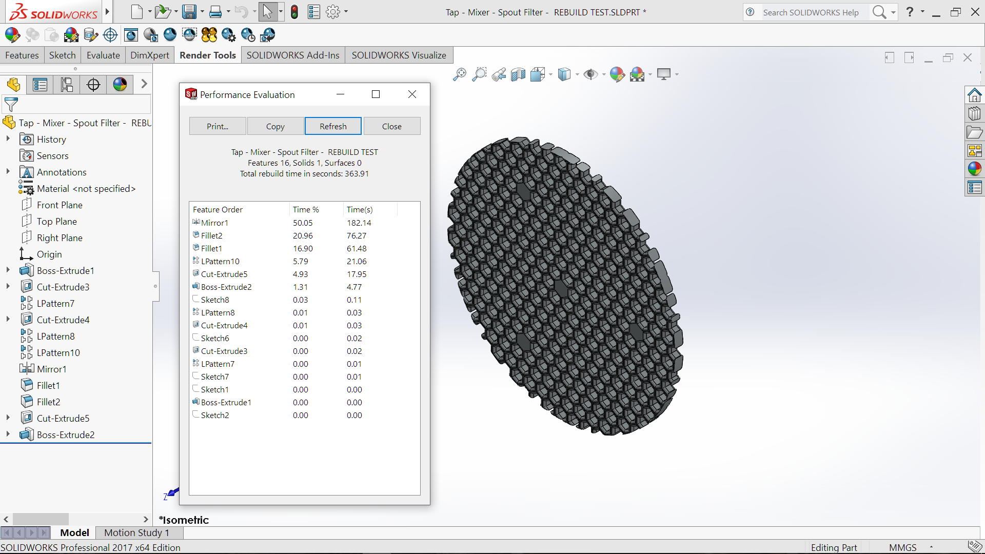 I have this little filter which is always good for testing.  It is only a small part – 6.38MB in size but with Linear Patterns, Mirroring of Patterns and  Fillets applied to those features it is always taxing on rebuild times!    The HP Spectre x360 has a rebuild time of 363.91seconds.   If I compare that to the msi WT72  which took 334.84second and my IC3D  that took 287.78seconds.  That is around 7% more than the WT72 and 20% over the IC3D.  Those figures look familiar!