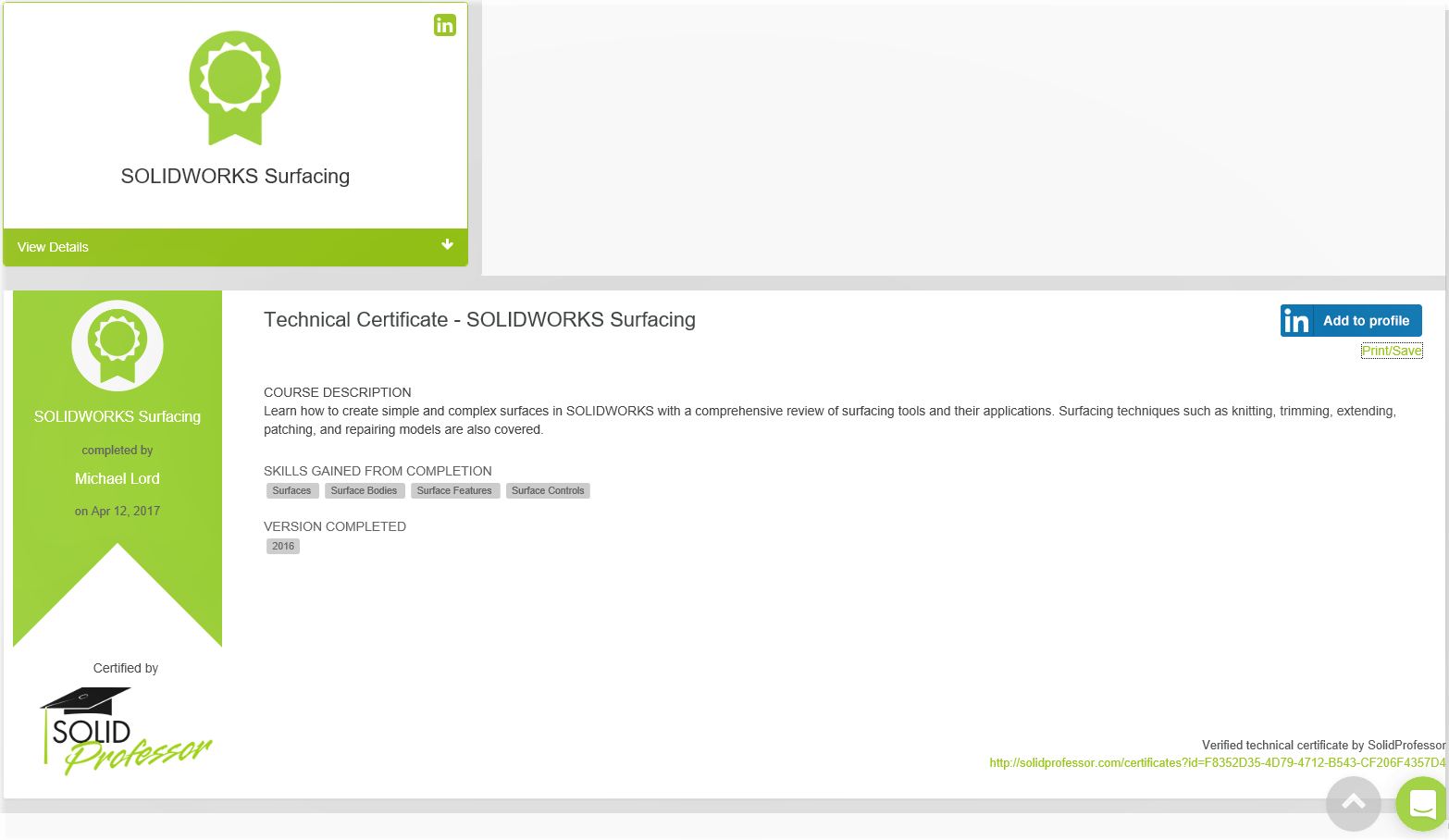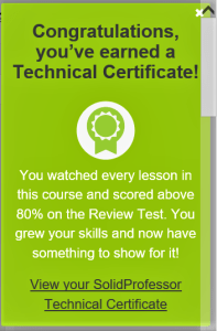 That is where SolidProfessor can comes in. SolidProfessor now has added Technical Certificates, for the majority of their lessons. Technical Certificates are achieved by successfully completing the Review Tests at the completion of each subject.