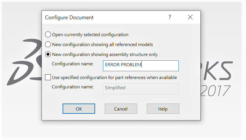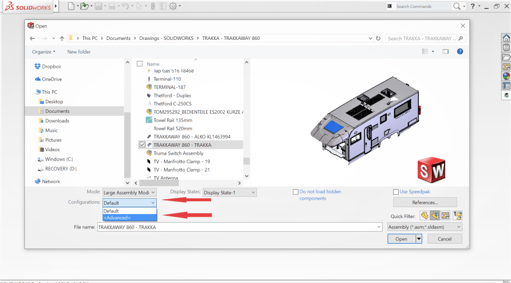 Select the Assembly required to be Opened. Look for the Configuration box, select and change Default to Advance and then select Open. This will open a new window dialogue box – Configure Document