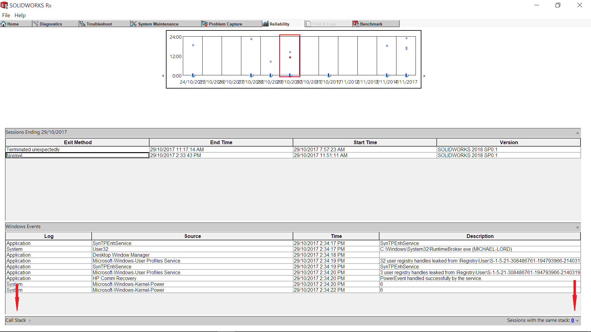 For reporting back to the user, starting with SOLIDWORKS 2018, you’ll notice that we are reporting the fault module in the crash dialog (see the images above). This can be helpful to the user since if it is reporting some module frequently, especially one that might be “human recognizable” like a module name that is clearly related to the graphics card or something else in the OS, then they can pursue looking into that. As already mentioned in this thread earlier, a collection of this information over time is available in SOLIDWORK Rx under the Reliability tab. Clicking on “Terminated unexpectedly” entries shows what is called a “Call stack” which is the fault module plus some additional information. And you’ll notice in the bottom right corner, it reports the number of sessions with the same call stack so something that may seem random can actually be seen as repeatable through this data. We don’t expect users to become experts on this stuff, but much of this information can be very useful for VARs who are helping troubleshoot problems for users.