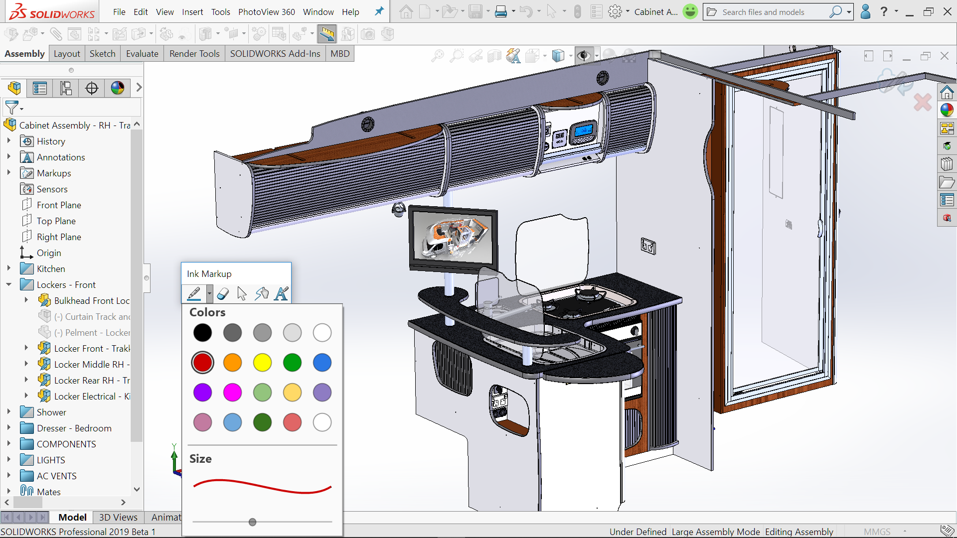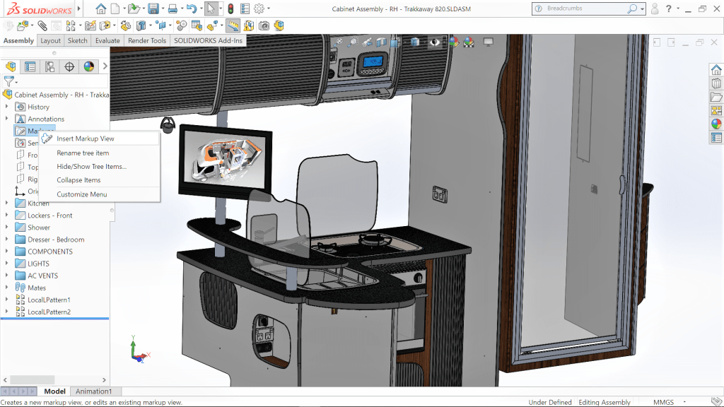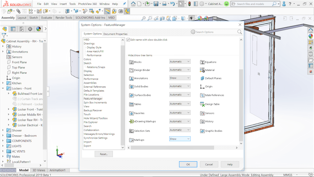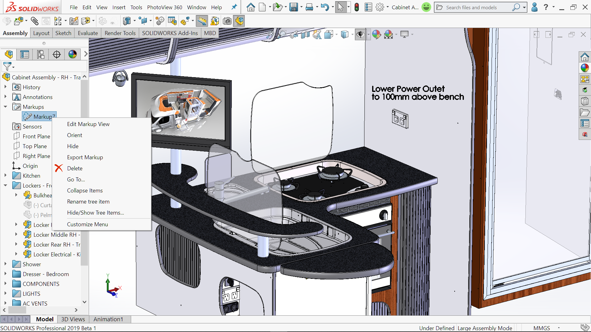 SOLIDWORKS 2019 sees the introduction of the ability to add and show Markups. A system setting, Systems Options>FeatureManager>Markups>Show, allows for a Markup folder to be added to the FeatureManager tree.