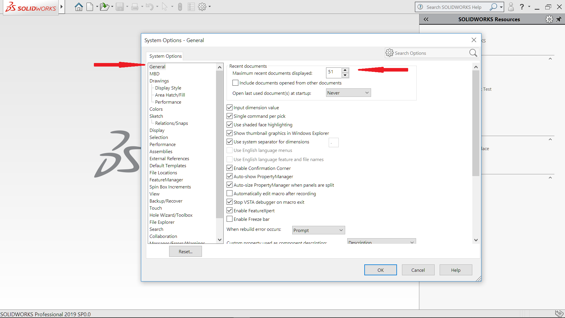 Introduced last year with SOLIDWORKS 2018 was the Welcome Dialogue box, which allowed access to the Recent Open Document. There is a simple enhancement which now sees the ability to specify the number of recent documents to display.