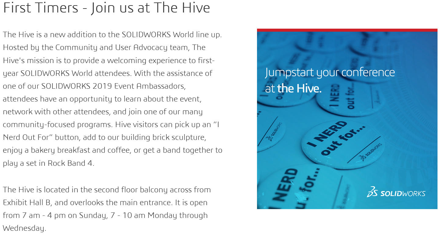 Something new for SOLIDWORKS World 2019 is the “The Hive”, a place were first timers can seek some advice and wise words about what they are just about to get into!