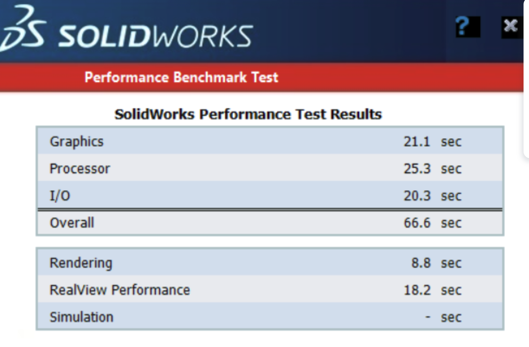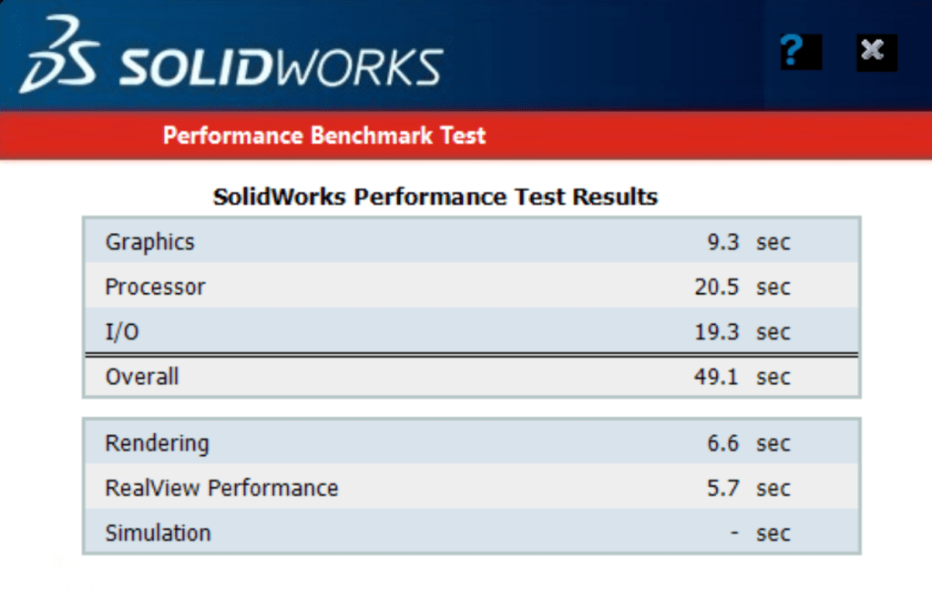 Out of interest this is the result from one of our work’s custom built desktop computers, running a liquid cooled overclocked Intel i9-9900KS 4.9Ghz & NIVDIA Quadro P2200. Graphics: 21.1sec, Processor 25.3sec, I/O 20.3sec = Overall 66.6 seconds. Rendering 8.8sec RealView Performance 18.2sec. Whilst this shouldn’t be taken as a direct comparison, after all it is three year older and running SOLIDWORKS 2022 SP5 on Windows 10.0.19045