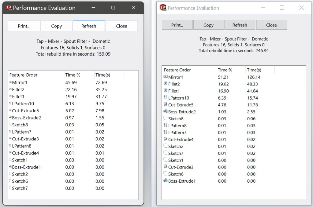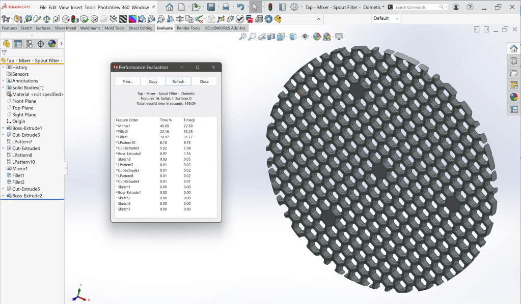 I like to run a rebuild tests with this little filter. It is only a small part – 6.38MB in size but the Linear Patterns, Mirroring of Patterns and then applying Fillets to those features are always taxing on rebuild times!