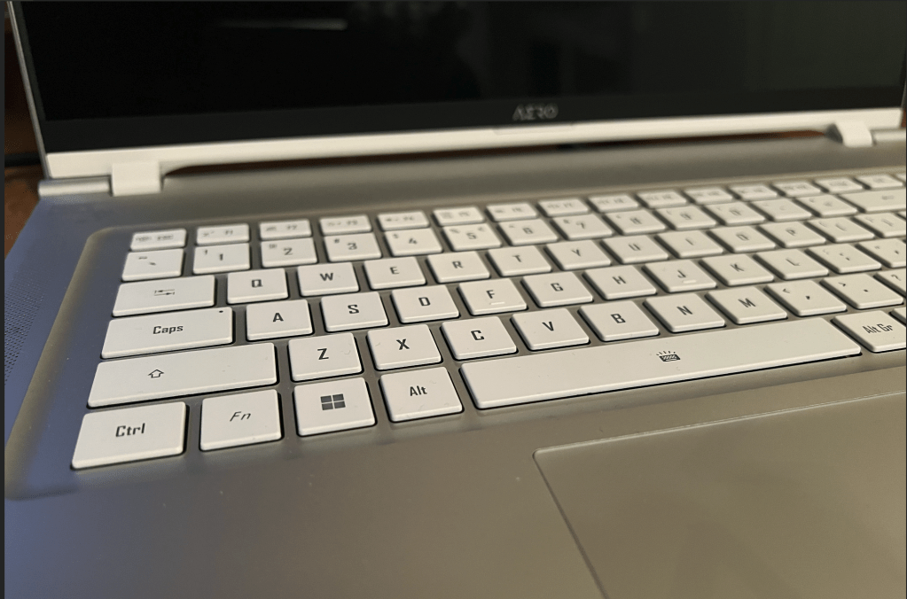 The keyboard can also be backlit. Most backlighting keyboard are normally just a toggle on or off function. With the AERO 16 you have three levels of brightness with a clever function to toggle through the range, which I haven’t seen before. This is done by using the Fn (Function) key + Space bar. There is a symbol on the Space bar to prompt this. The backlighting also automatically turns off when there is no keyboard use for 5minutes. It reactivates with the touch to any of the keys.