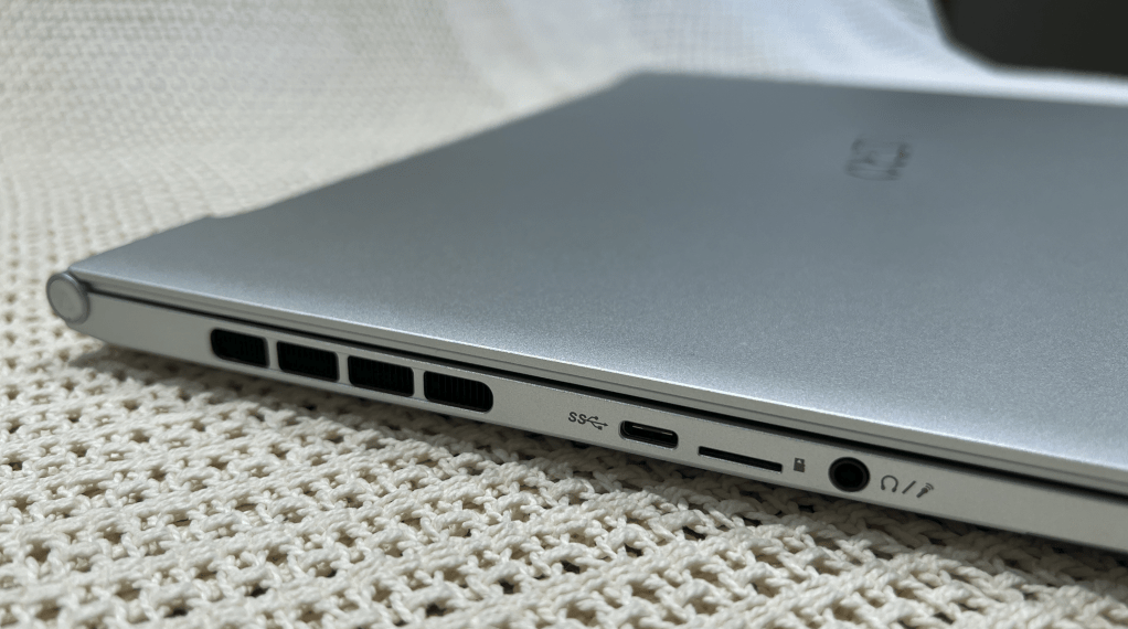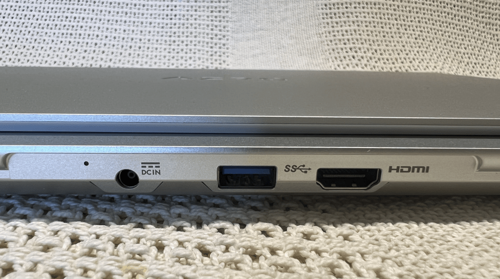 I’m a big fan of a power connection that connect at the back of a laptop. It just seems to make more sense allowing the lead to head off in either direction. For the same reasoning I like the HDMI2.1 output for a monitor connection there as well. Along with those connections there is a USB3.2 (Type A) which is convenient, for the Logitech wireless receiver I use with my wireless Logitech MX Ergo Trackball .